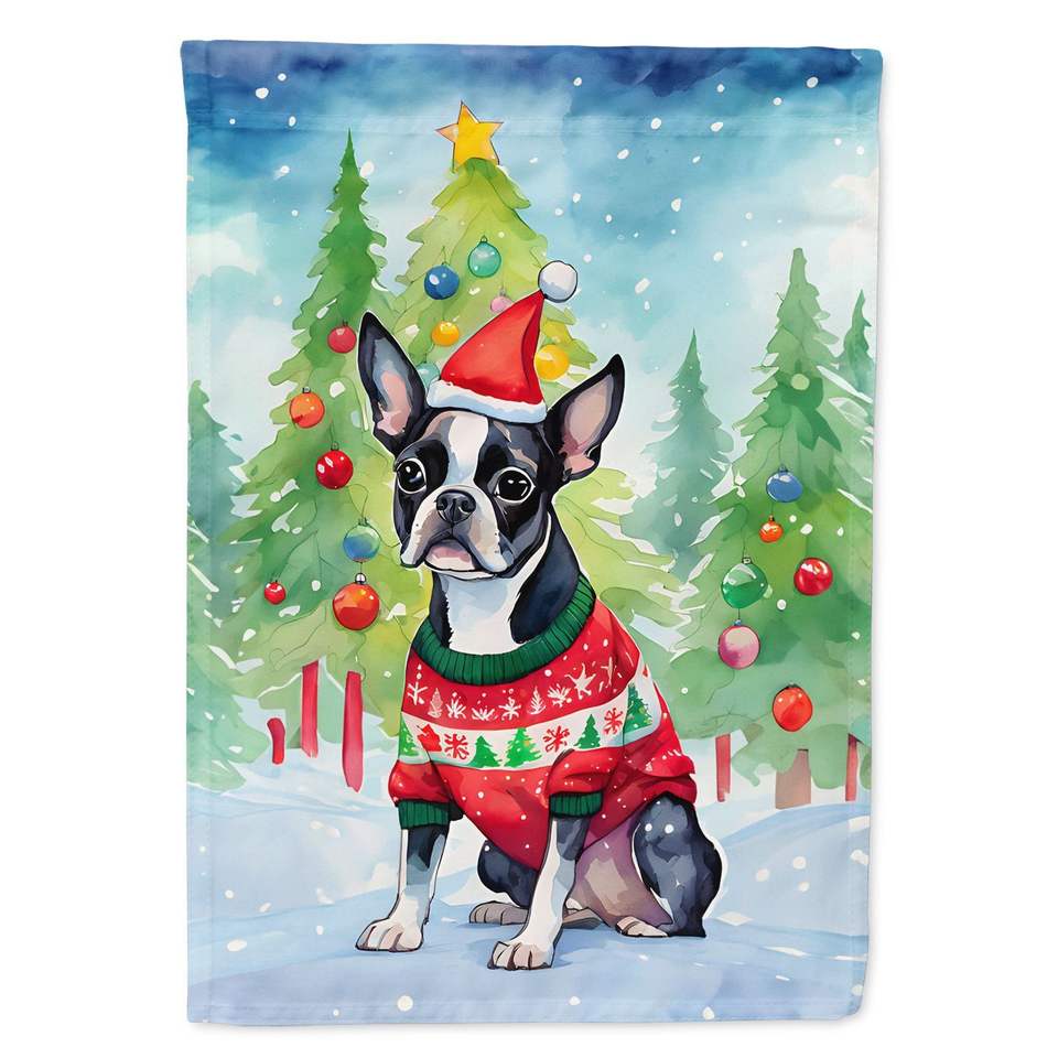 แบนเนอร์ขนาดใหญ่ลายคริสมาสต์บอสตันเทร์เรียร์สำหรับแขวนผนังป้ายโพลีเอสเตอร์หลากสีสำหรับตกแต่งระเบียง
