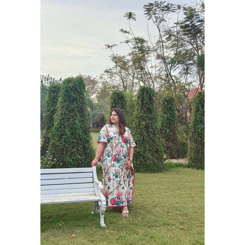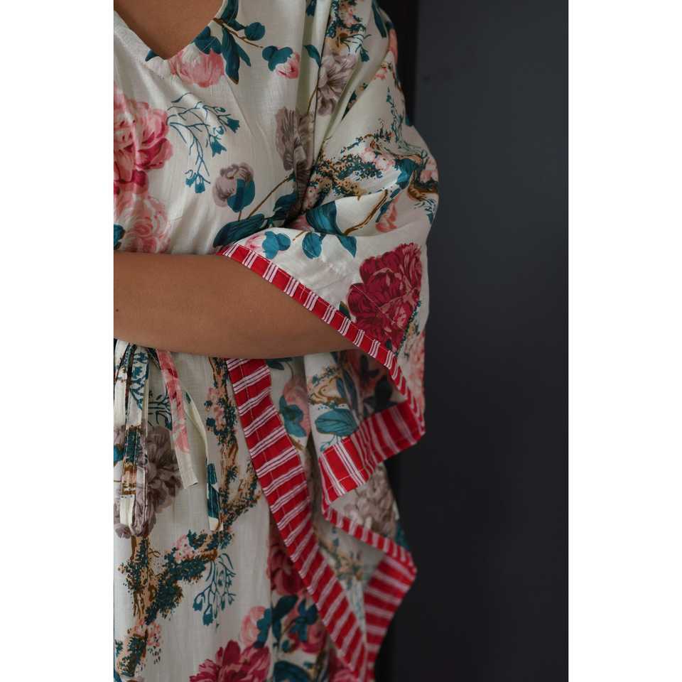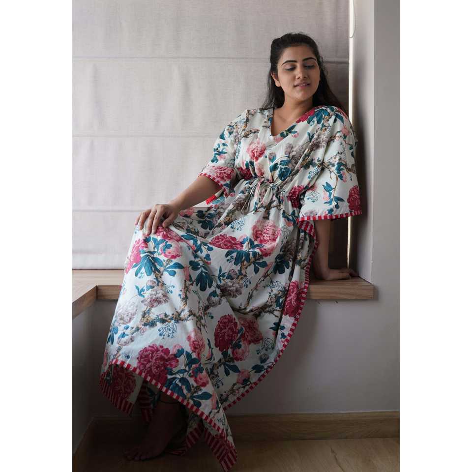 ชุดคาฟทันผ้าฝ้ายพิมพ์ลายดอกไม้สีขาว ฟรีไซส์สำหรับผู้หญิง แบรนด์ Botanic Bae แต่งระบายขอบตัดกัน ระบายอากาศได้ดี 100% ผ้าฝ้าย