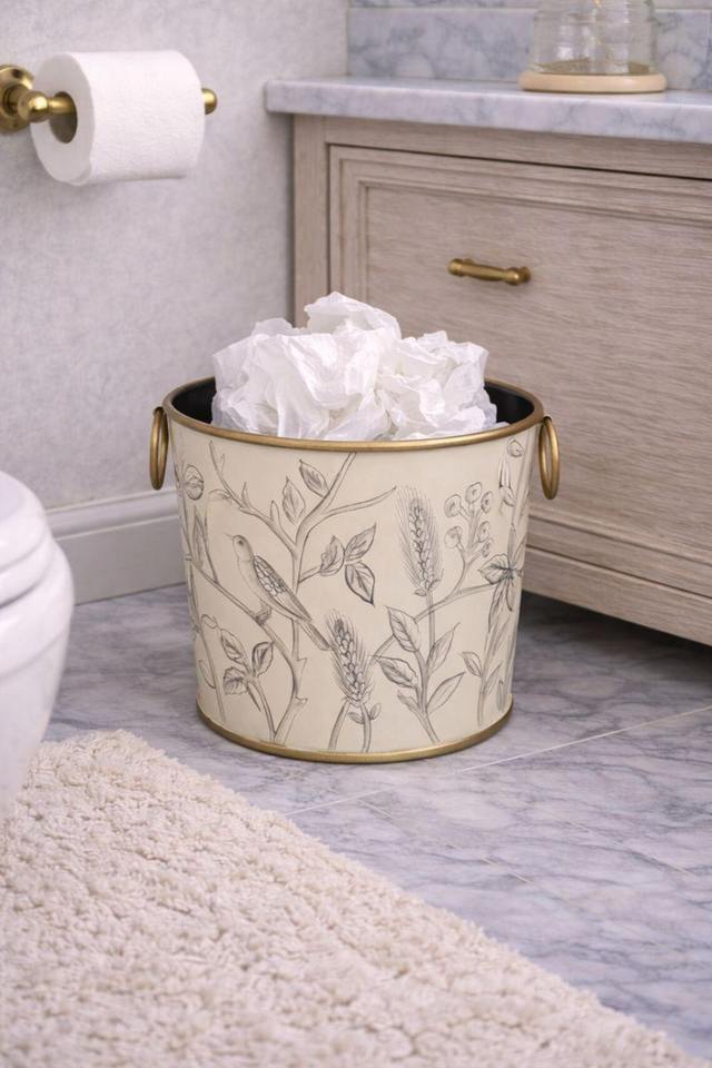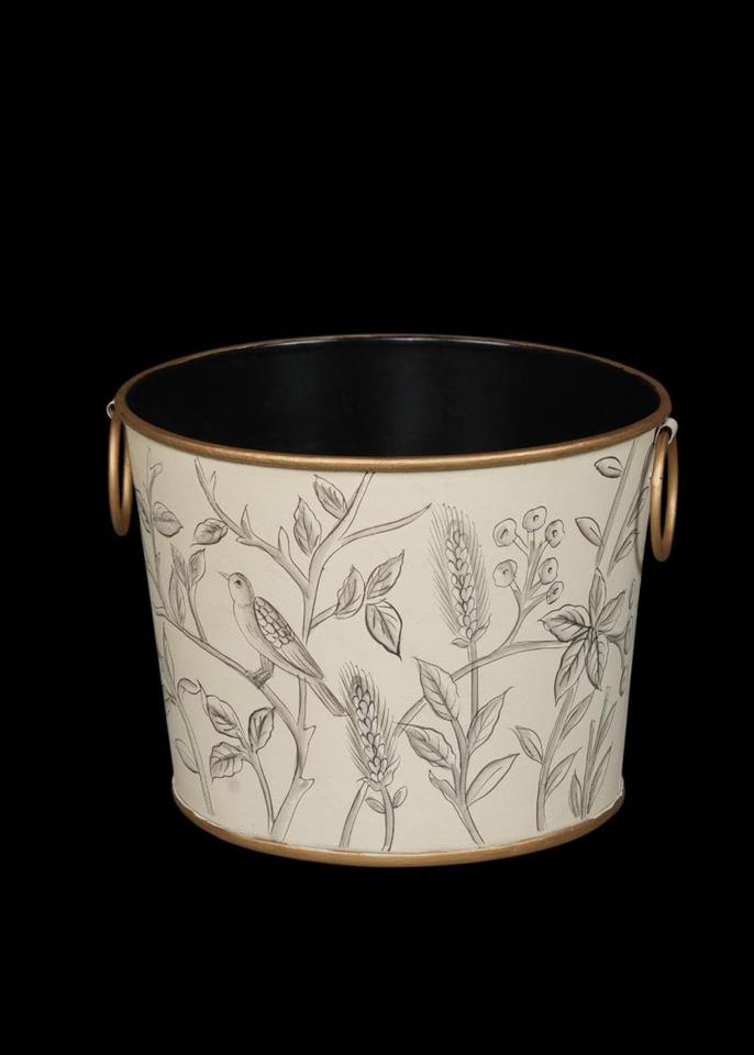 ถังขยะโลหะลายพิมพ์นกพฤกษศาสตร์ พร้อมหูจับสีทองคู่ สำหรับตกแต่งภายในบูติกหรือโรงแรม จากอินเดีย