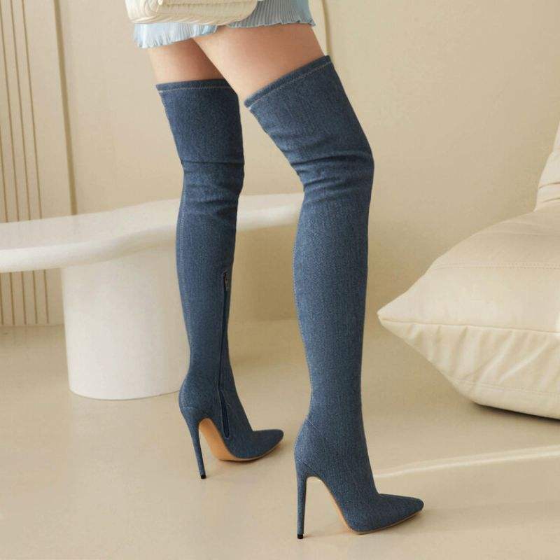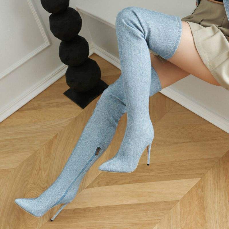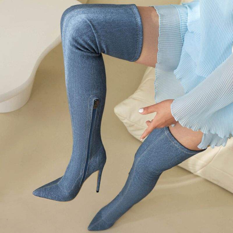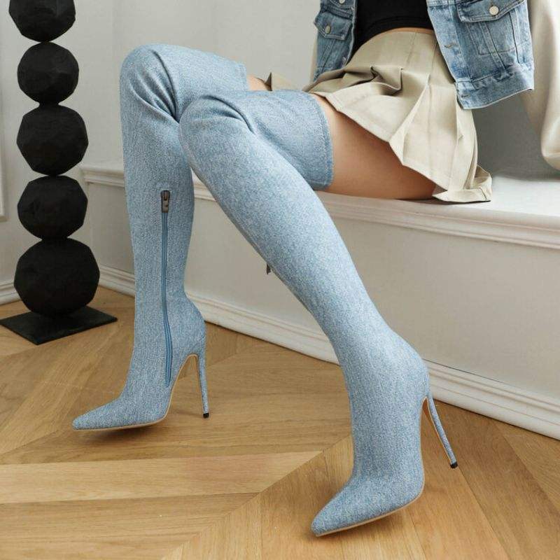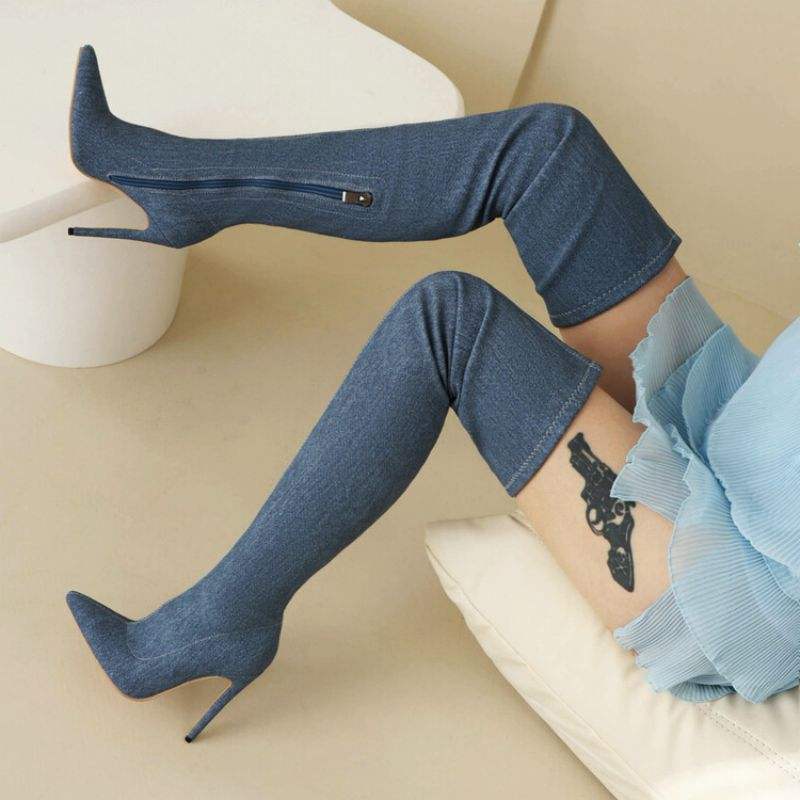 รองเท้าบูทส้นเข็มทรงสูงเหนือเข่าสีน้ำเงิน รุ่นใหม่ทันสมัยสำหรับผู้หญิง