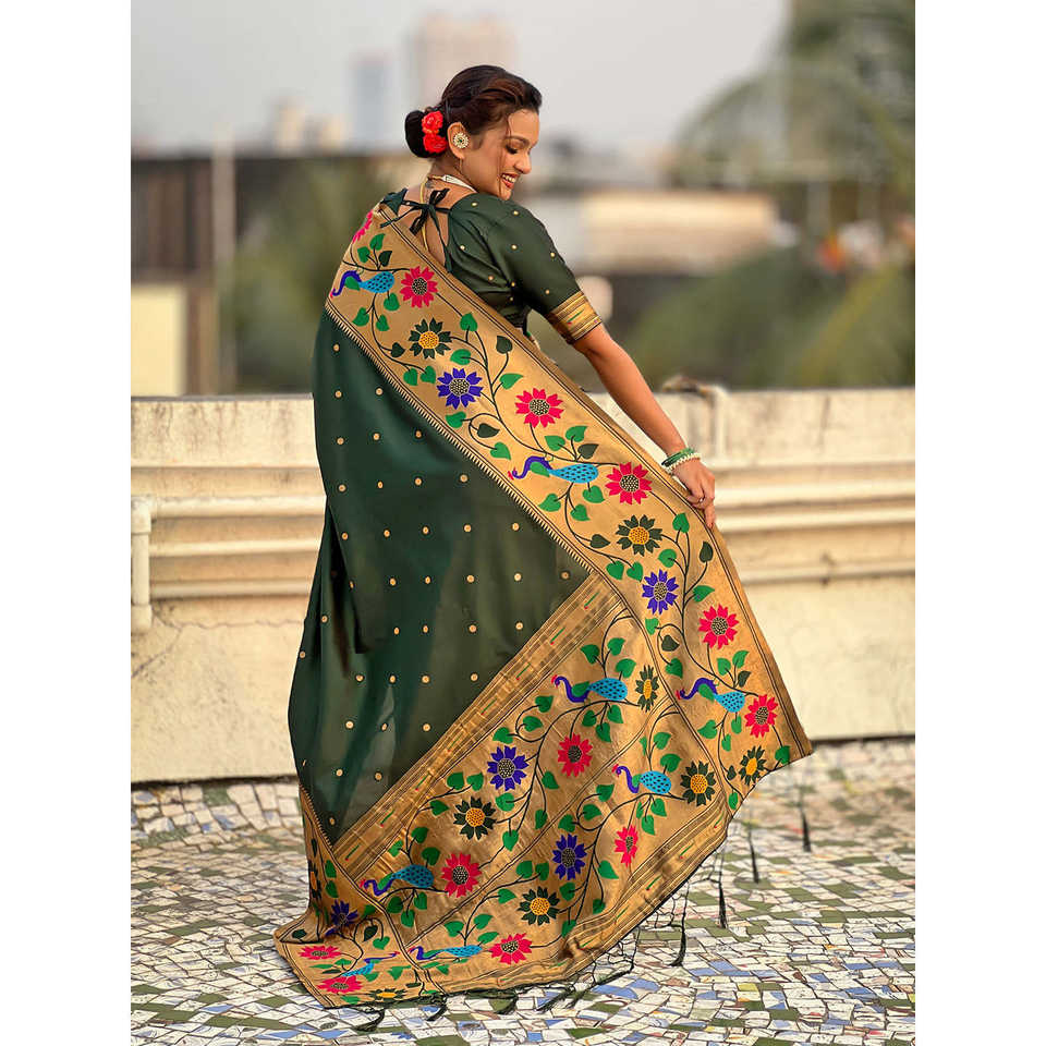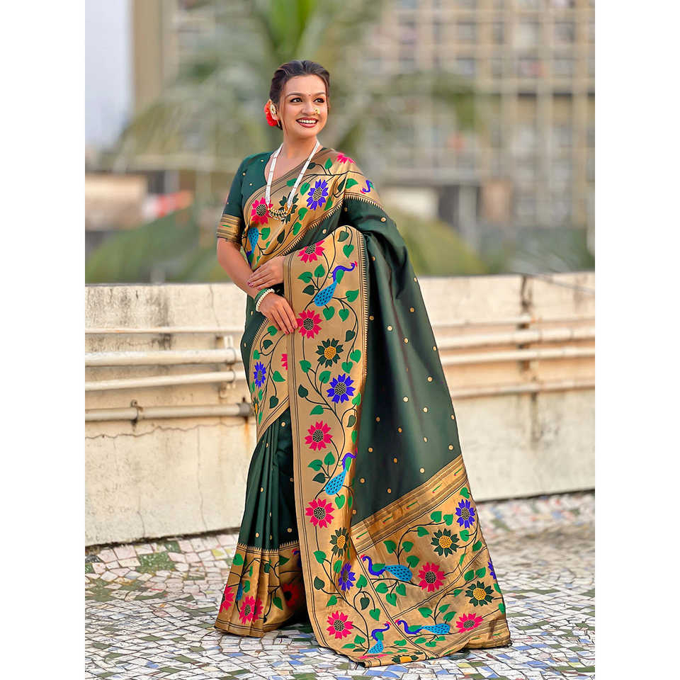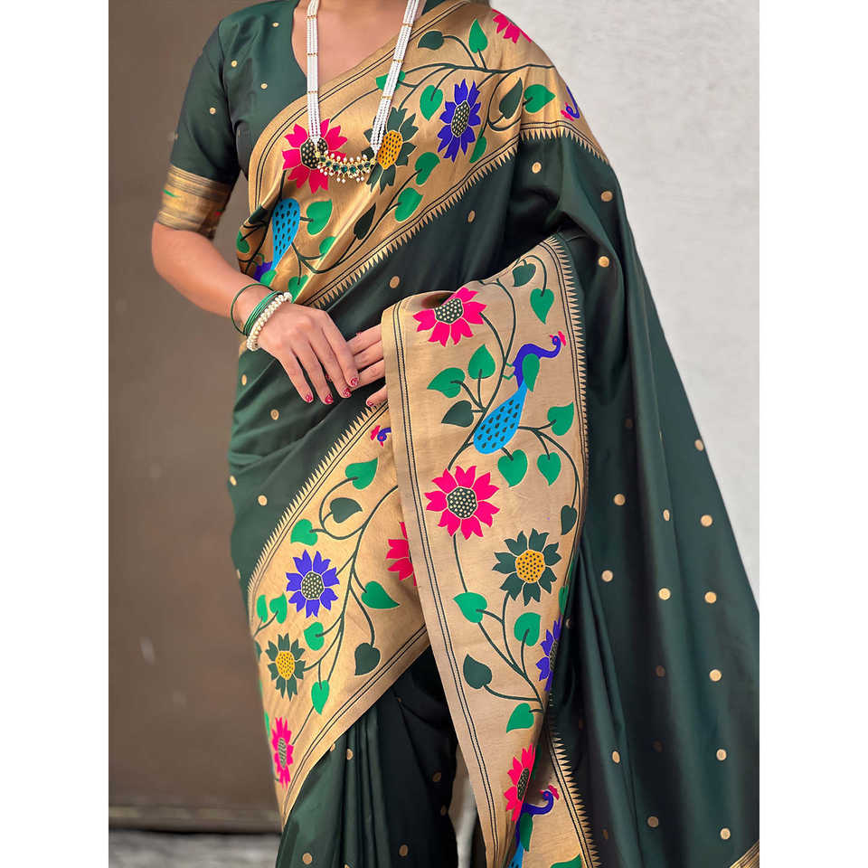 ผ้าไหมปาธานีสีเขียวขวด ขอบใหญ่ ปักดิ้นทอง ผ้าทอสำหรับงานพิธี ป้องกันแสงแดด ชุดส่าหรีอินเดียและปากีสถาน งานทอชั้นสูง น้ำหนัก 650 กรัม