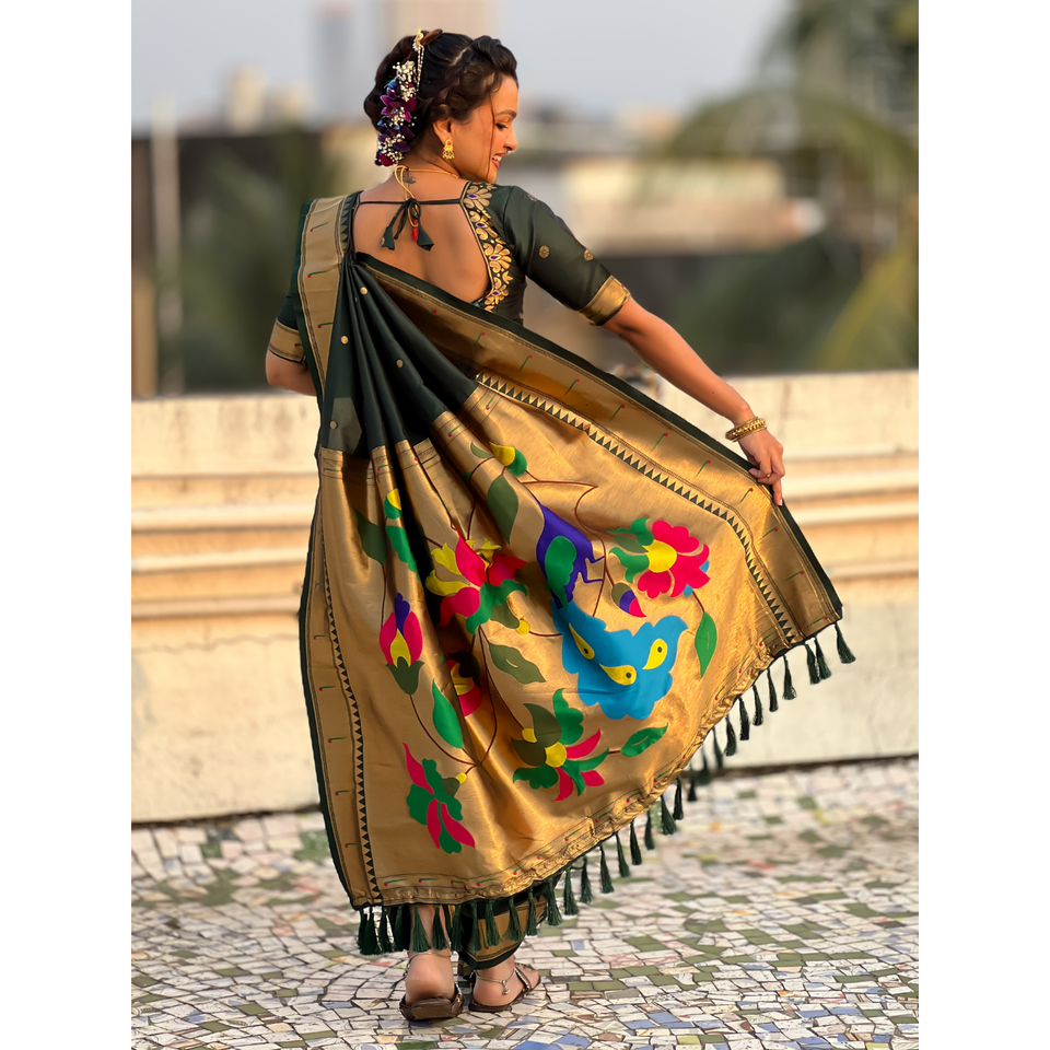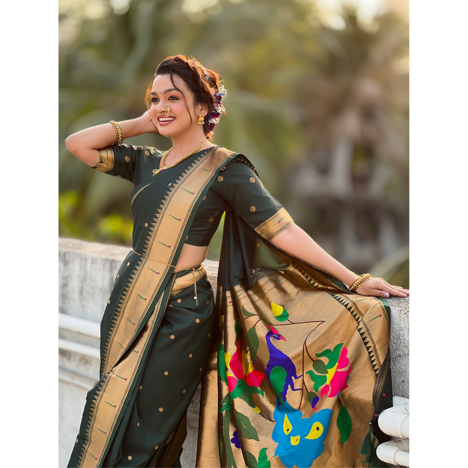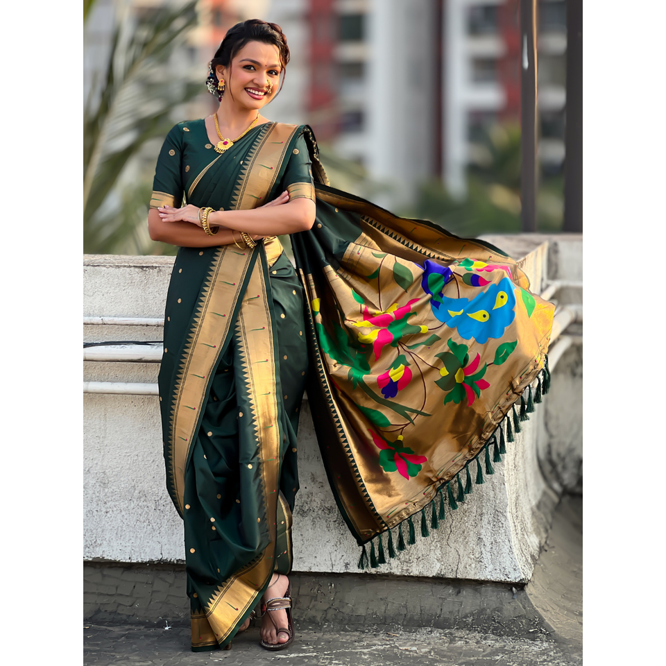 ผ้าส่าหรีไหมเนื้อนุ่มสีเขียวขวด นาวารี ปายธานี ลายปักดิ้นทอง พร้อมลายจุด และผ้าคลุมไหล่ลายนกยูง สำหรับงานแต่งงาน