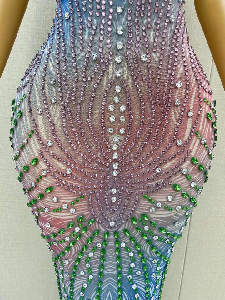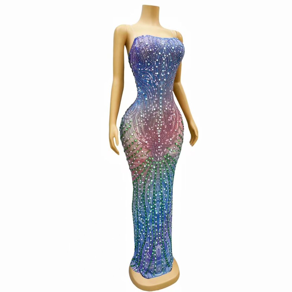 ชุดเดรสยาวถึงพื้นสำหรับงานปาร์ตี้ชุดราตรีชุดราตรีชุดราตรีเปิดไหล่ติดเพชรสีรุ้ง