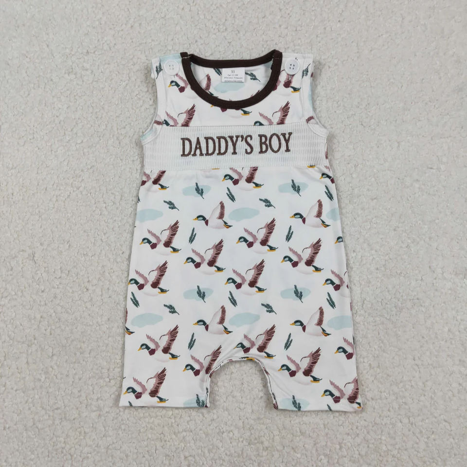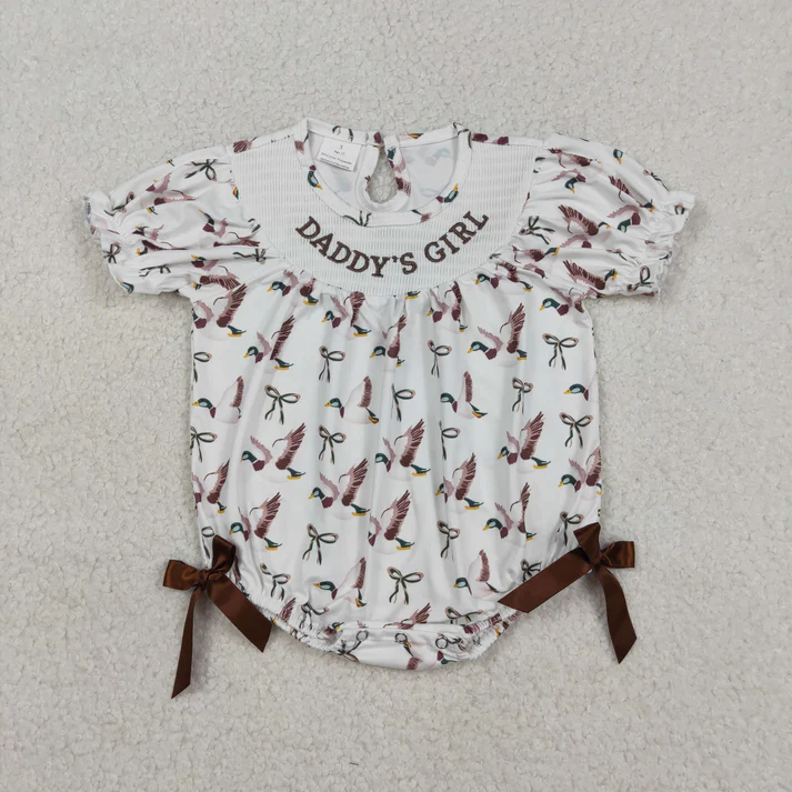 ชุดเดรสเด็กผู้หญิงสไตล์บูติกสำหรับฤดูใบไม้ผลิ ลายปักวันพ่อ "Daddy's Girl/Boy" ลายเป็ด แขนสั้น แต่งสม็อค ทรงบับเบิ้ลรอมเปอร์