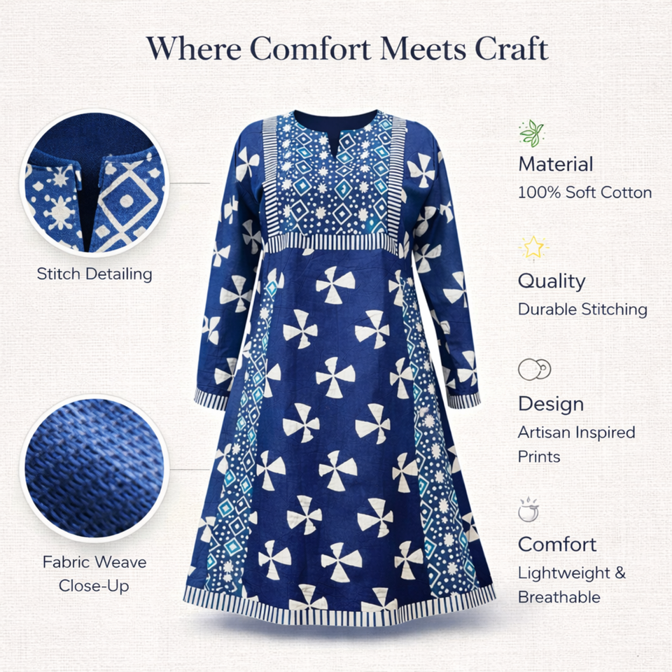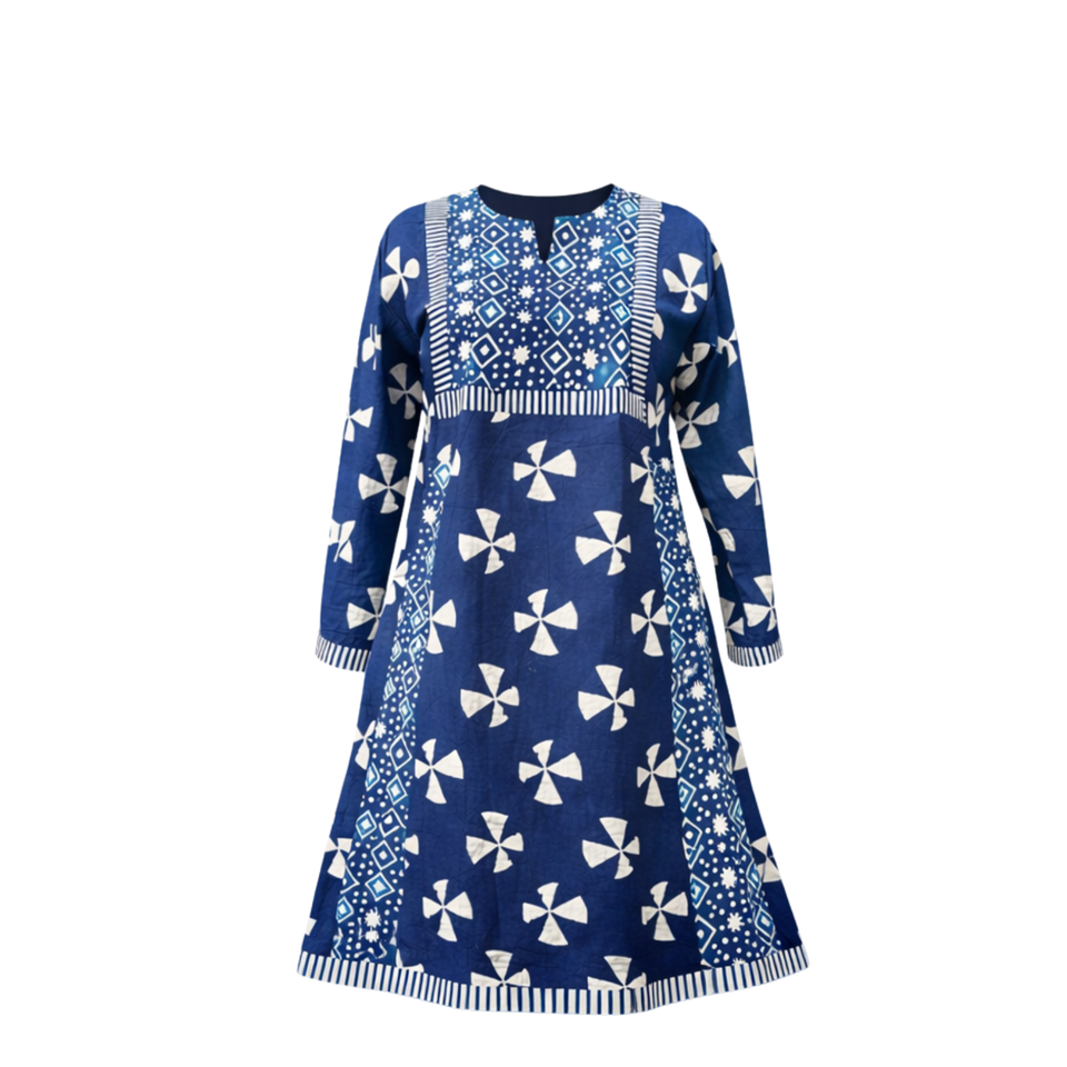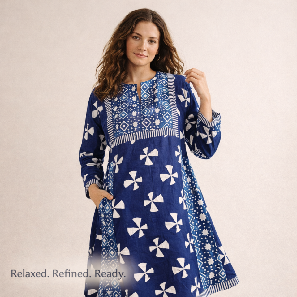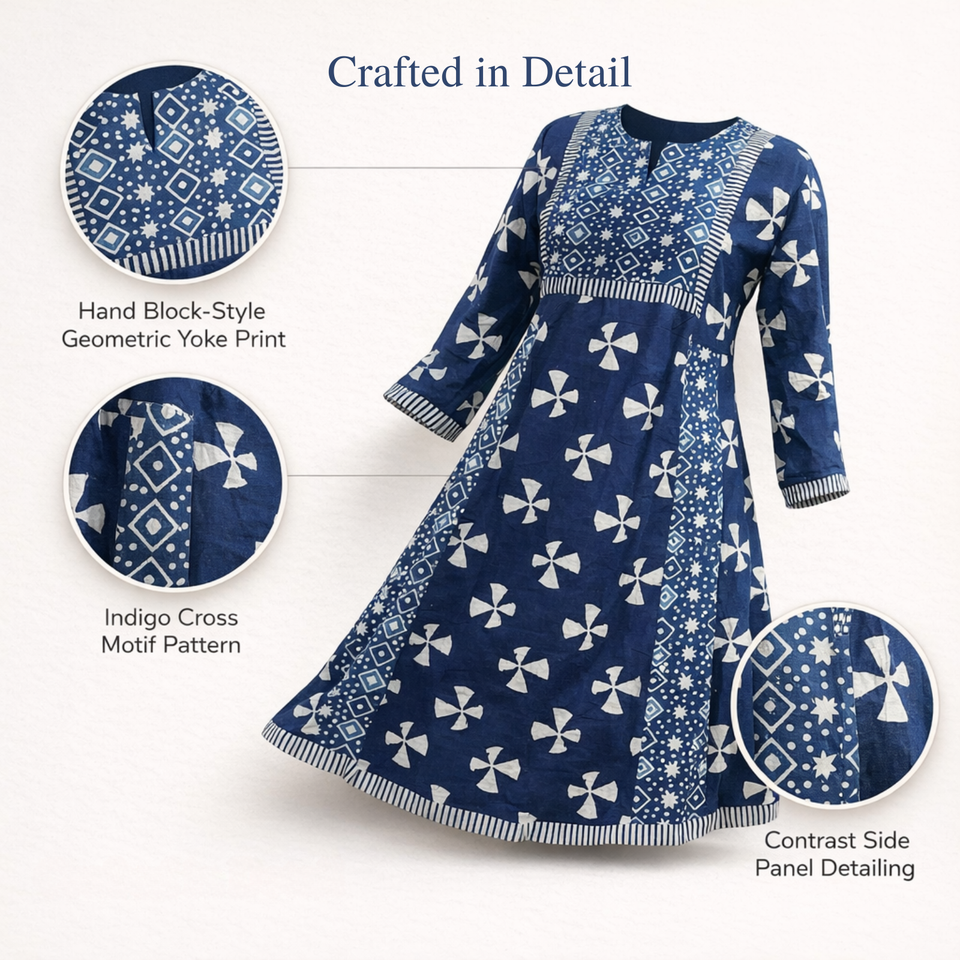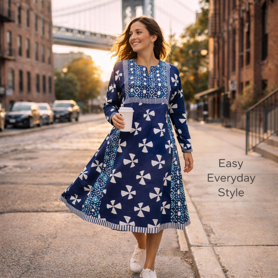 ชุดเดรสผ้าฝ้ายอินดิโก้ทำมือคุณภาพระดับบูติก คอวีเล็ก แขนยาว ลายตัดกัน ชุดเดรสยาวปานกลางสำหรับผู้หญิง