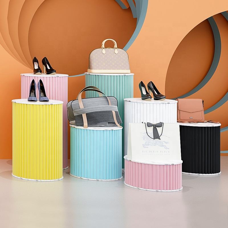 แท่นโชว์ทรงกระบอกสีขาวสำหรับตกแต่งร้านบูติก วางรองเท้า กระเป๋า และดอกไม้ เหมาะสำหรับงานแต่งงาน
