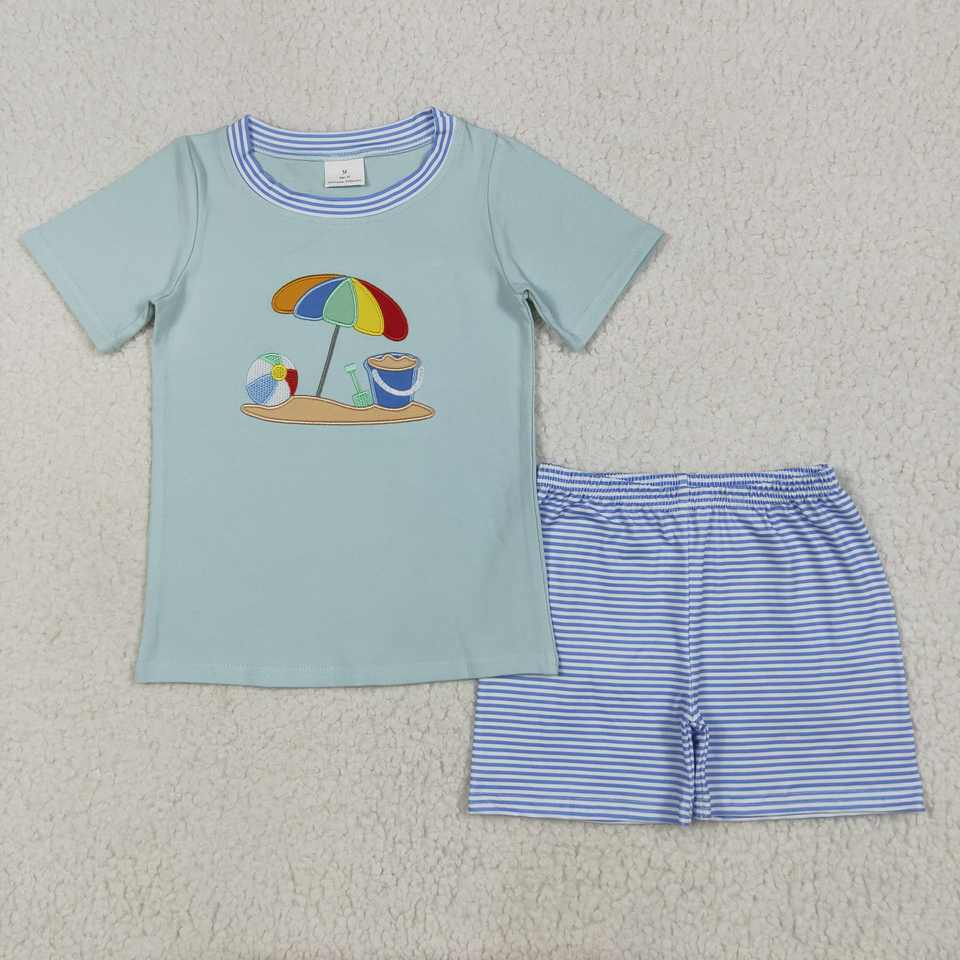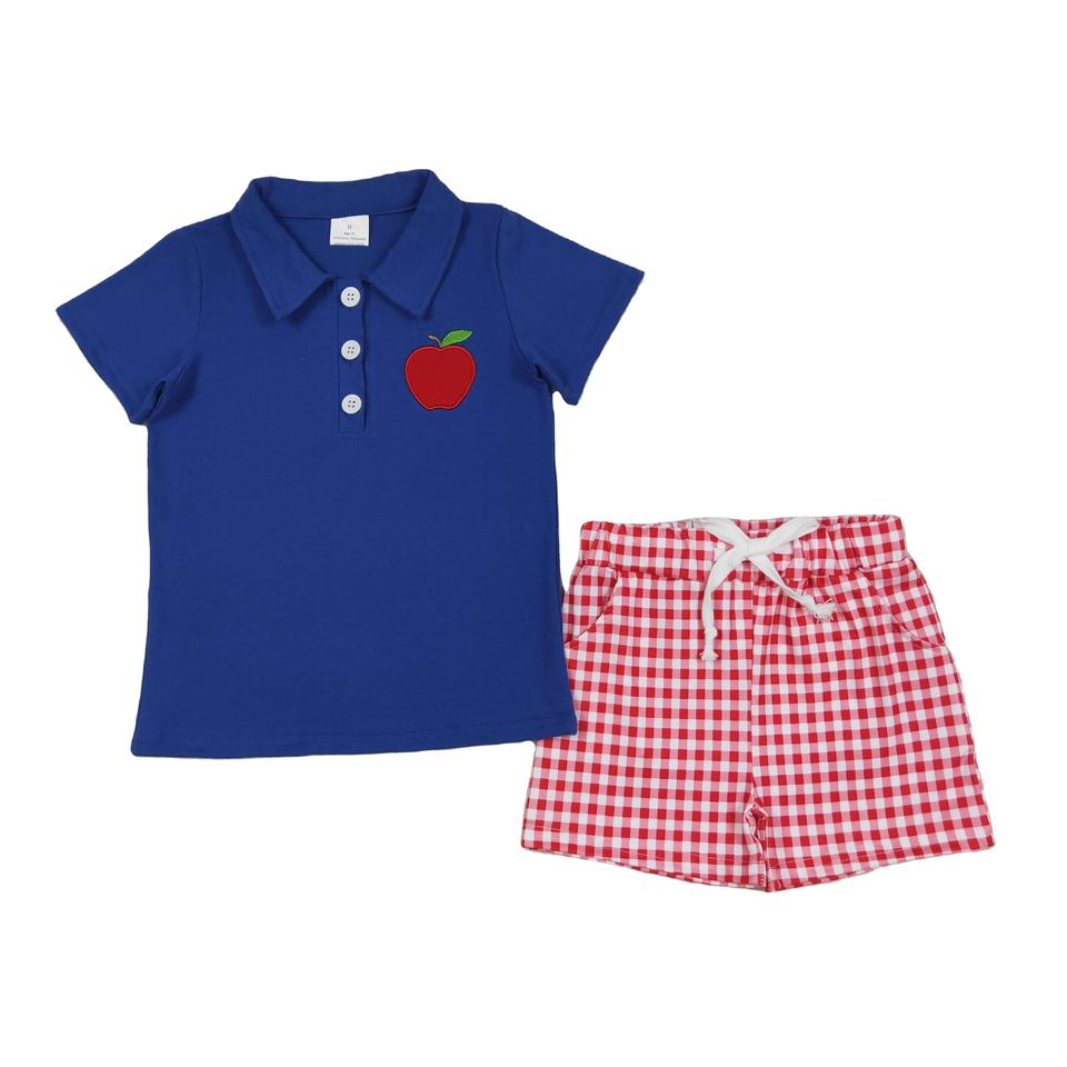 ชุดเสื้อผ้าขาสั้นสำหรับเด็กชายวัยหัดเดินปักลายแอปเปิ้ลสีน้ำเงินเข้มสไตล์บูติคสำหรับฤดูร้อน