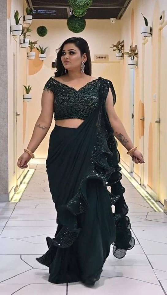 สไตล์บูติกใหม่แฟนซีปาร์ตี้สวมFaux GeorgetteลําดับงานและRuffle Lehenga Sareeพร้อมเสื้อในราคาขายส่ง