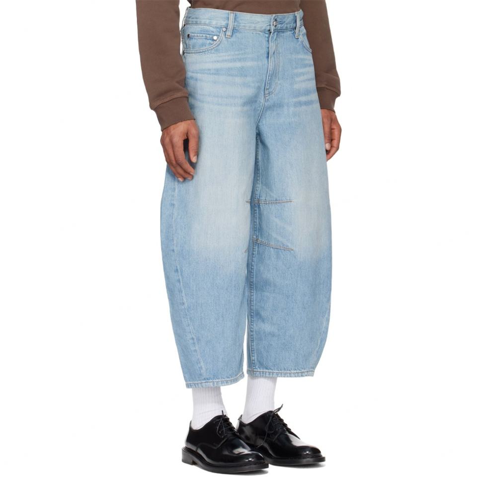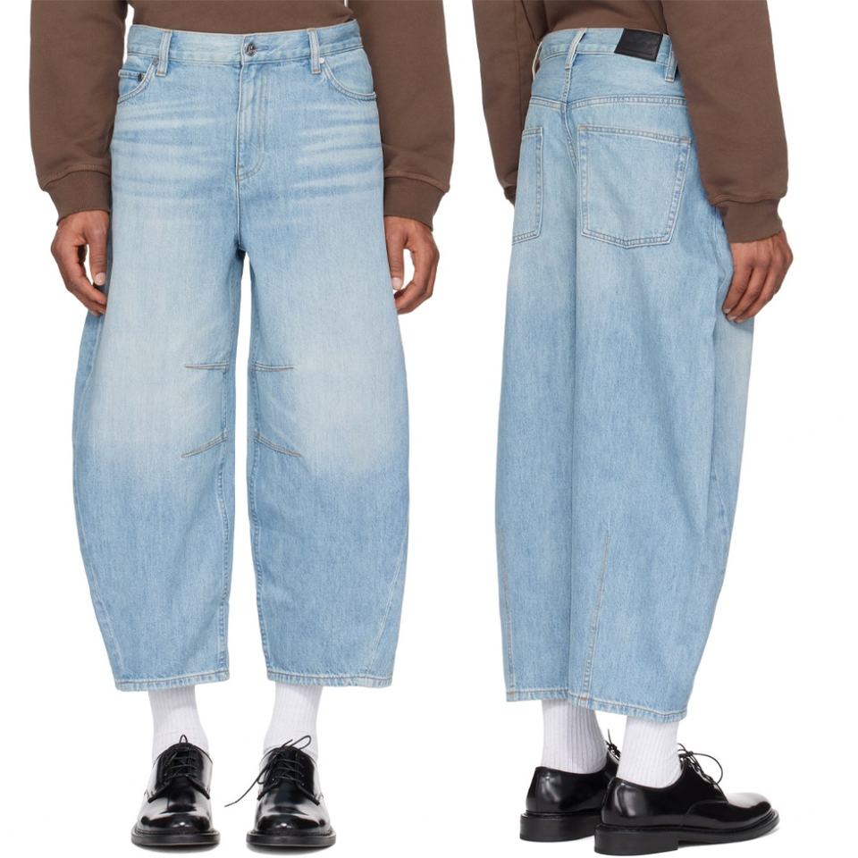 กางเกงยีนส์ทรงบาร์เรลสีน้ำเงินฟอกสไตล์ลำลองเอวกลางทรงหลวมขาบานสำหรับผู้ชายขายส่งแบบบูติก
