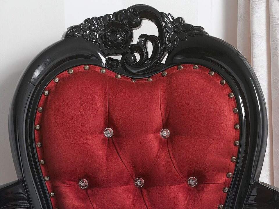 คำอธิบาย:เก้าอี้ทานอาหารไม้ ที่พักแขนสไตล์บาโรกเคลือบแล็กเกอร์สีดำ