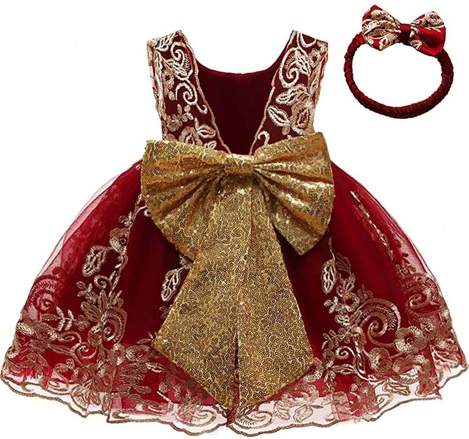 Bowknot Sequins Embroidered Lace Party Tutu Gown Toddler Baby Girls Dress with Headwear