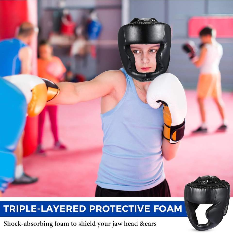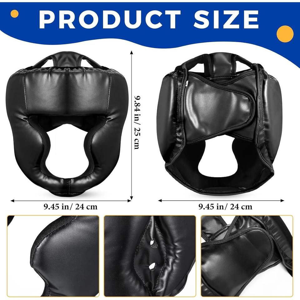 หมวกชกมวยหนัง PU สีดำ ปรับขนาดได้ ป้องกันศีรษะ สำหรับ MMA มวยไทย คิกบ็อกซิ่ง ฝึกซ้อม