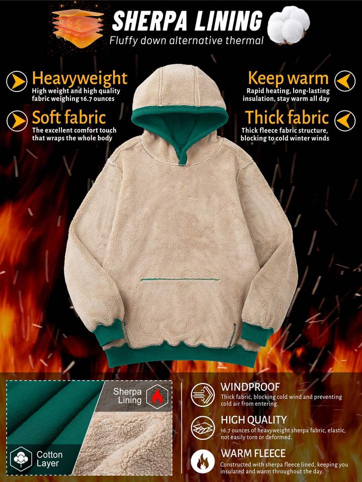Boxy เสื้อฮู้ดผู้ชาย, เสื้อกันหนาวขนแกะ380gsm ผสมกระเป๋าผ้าถักพิมพ์ลายธรรมดาฤดูหนาว
