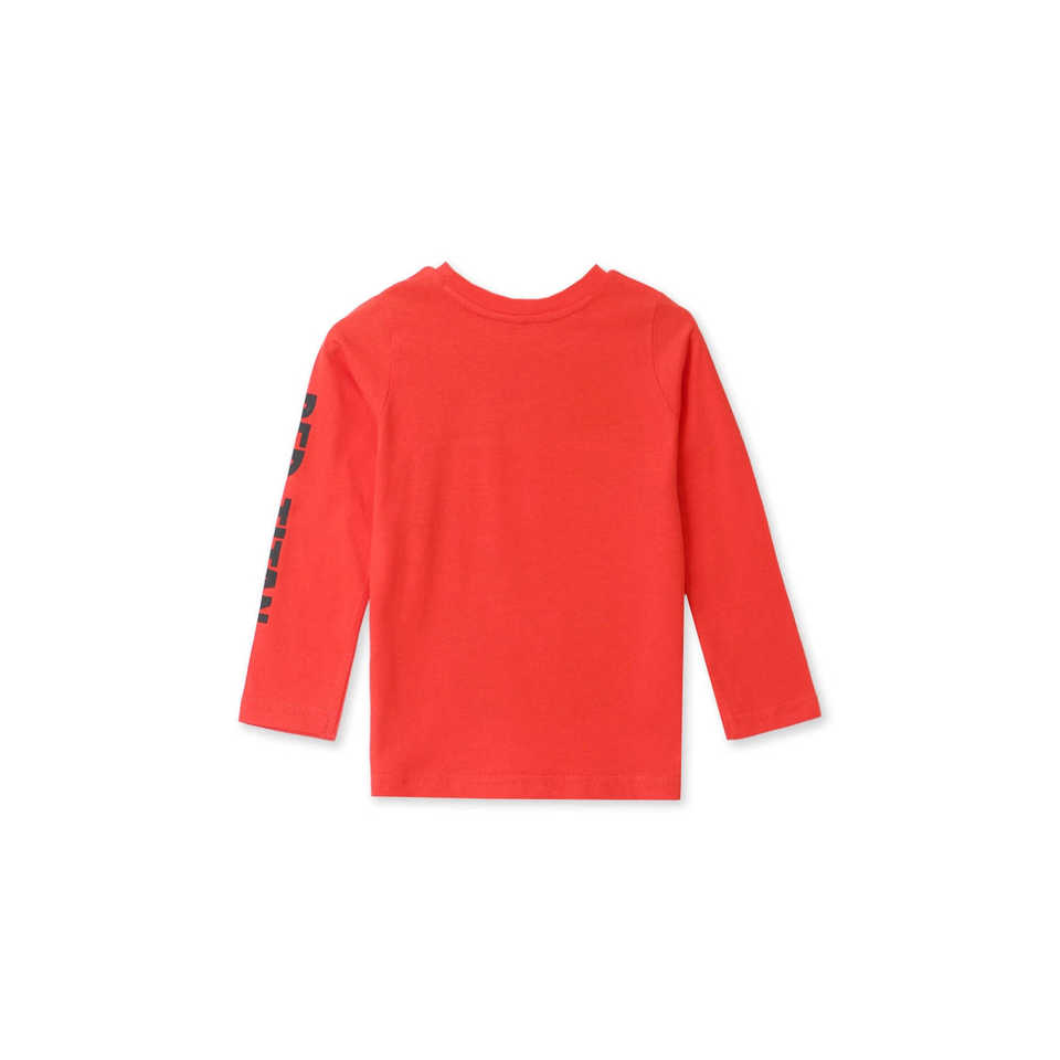 เสื้อยืดแขนสั้นคอกลมลำลองพิมพ์ลายกราฟฟิคสำหรับเด็กชายผ้าคอตตอน100% สีแดง f/ S โลโก้ตามสั่ง