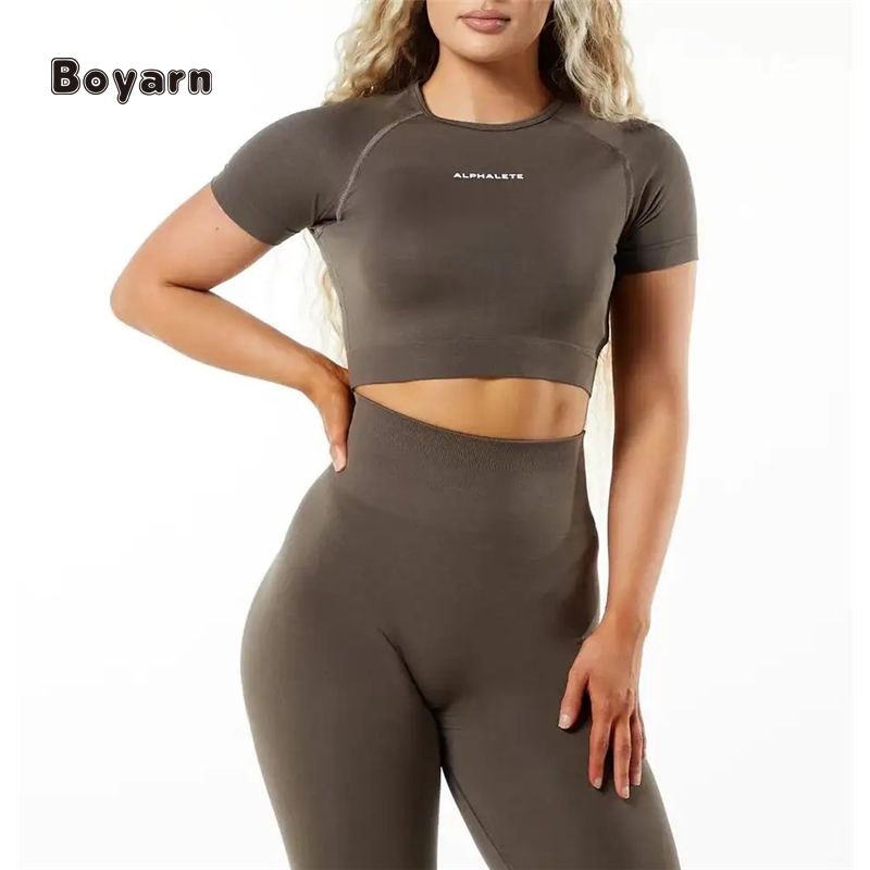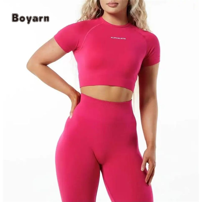 Boyarn เสื้อยืดแขนสั้นไร้รอยต่อสำหรับผู้หญิงเสื้อครอปแบบ4ทางสำหรับออกกำลังกายสีชมพู