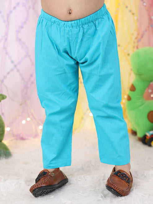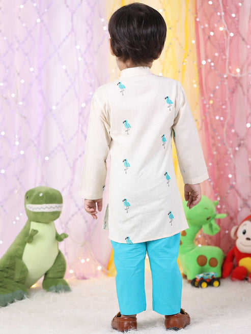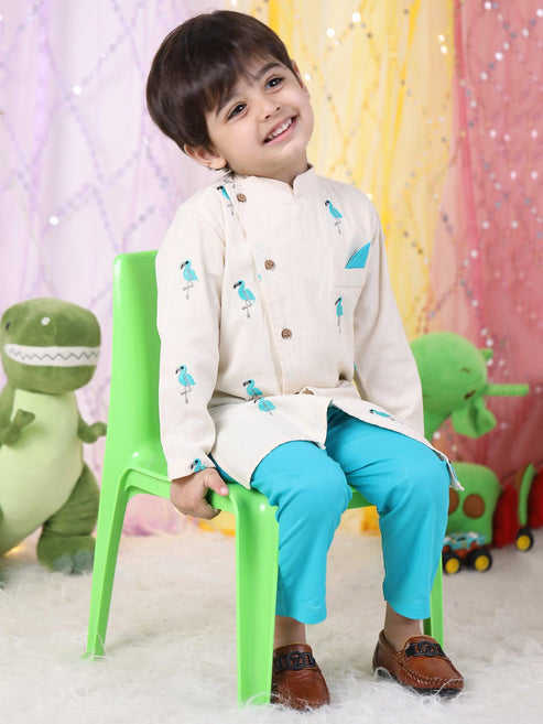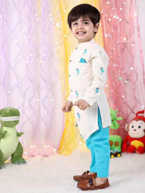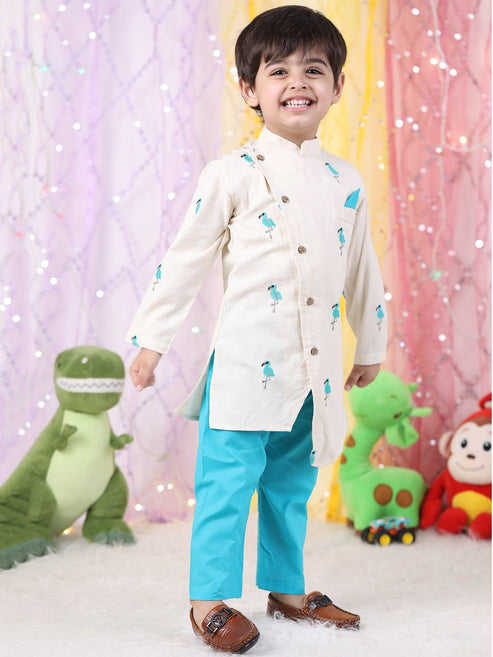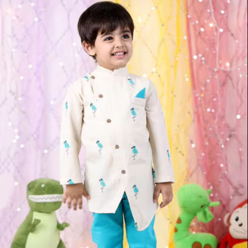ชุดเชอร์วานีปักลายครีมสำหรับเด็กผู้ชาย พร้อมกางเกงสีน้ำเงิน ชุดพื้นเมืองสำหรับงานเทศกาล งานแต่งงาน และงานเลี้ยงแบบดั้งเดิม
