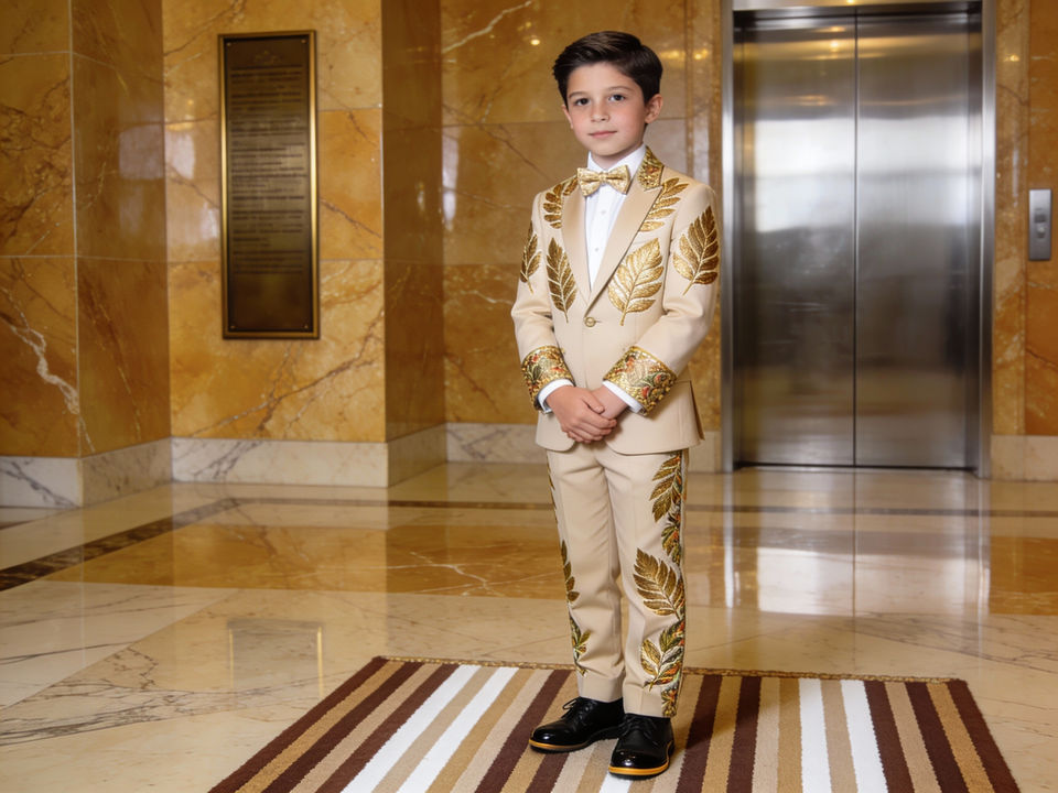 ชุดสูทเด็กผู้ชายปักลายใบไม้สีทอง – ชุดทักซิโด้สำหรับงานแต่งงานและงานปาร์ตี้