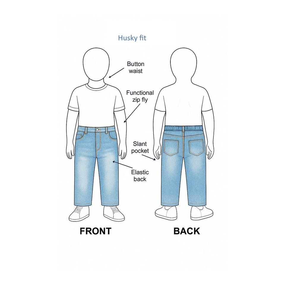 กางเกงยีนส์เด็กผู้ชายทรงฮัสกี้ฟิต ล้างสีแบบดับเบิ้ลสโตน ปิดด้วยกระดุมและซิป เอวยางยืด สวมใส่สบาย ทนทาน สไตล์ลำลอง