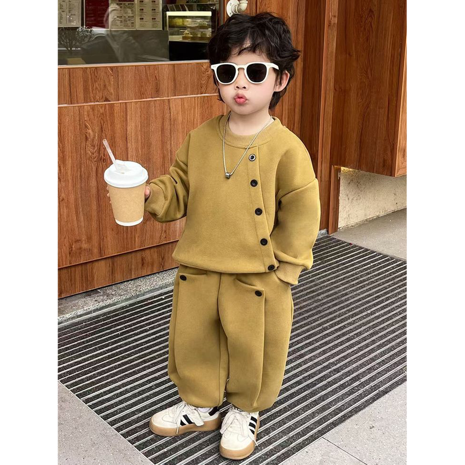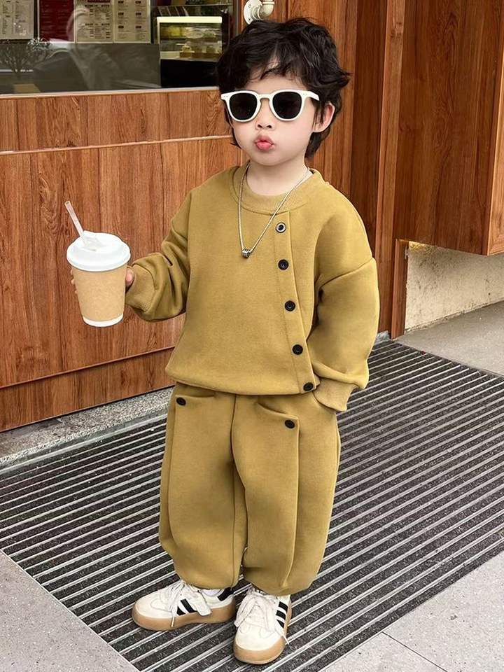 ชุดเซ็ตเสื้อสเวตเชิ้ตกระดุมไม่เรียงแถวสีเหลืองมัสตาร์ดสำหรับเด็กผู้ชายและกางเกงจ็อกเกอร์