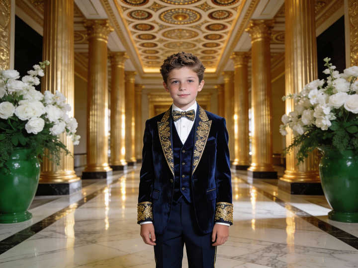 ชุดทักซิโด้กำมะหยี่สีน้ำเงินกรมท่าสำหรับเด็กผู้ชาย พร้อมงานปักสีทอง ชุดสูทสำหรับงานแต่งงานและงานเลี้ยงอย่างเป็นทางการ