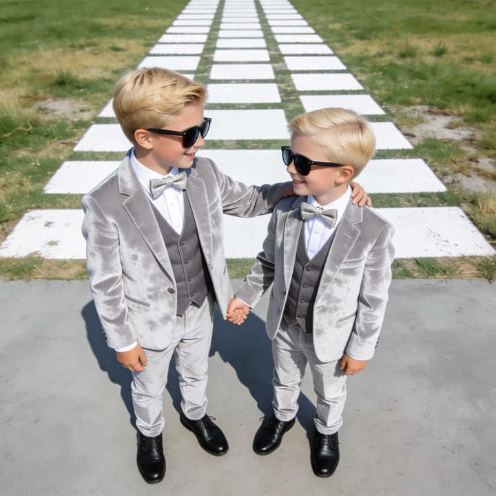 ชุดทักซิโด้กำมะหยี่สีเงินสำหรับเด็กผู้ชาย ชุด 3 ชิ้น – เสื้อเบลเซอร์ กางเกง และเนคไทโบว์ | ชุดงานแต่งงานและงานเลี้ยงสำหรับเด็ก
