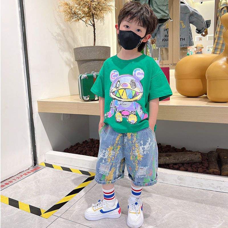 ชุดแขนสั้นสำหรับเด็กผู้ชาย, เสื้อยืดแฟชั่นสำหรับเด็กผู้ชายแนวชาวต่างชาติกางเกงยีนส์2023เสื้อผ้าเด็กใหม่สำหรับฤดูร้อน