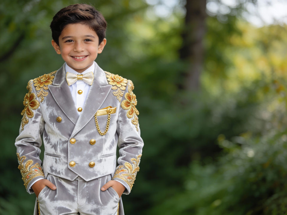 ชุดทักซิโด้กำมะหยี่สีเขียวอมฟ้าปักลายสำหรับเด็กผู้ชาย ชุดสูทสำหรับงานแต่งงานและงานเลี้ยง