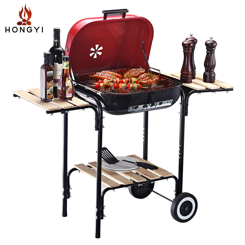 Bqr18t2w รถเข็นปิ้งย่างสำหรับตั้งแคมป์กลางแจ้ง รูปทรงแฮมเบอร์เกอร์แบบหนา สไตล์อเมริกัน พร้อมล้อและโต๊ะข้างสำหรับบาร์บีคิว