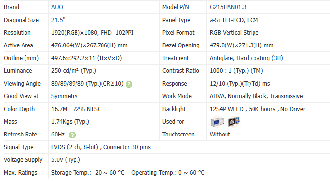 จอ LCD อุตสาหกรรม AUO 21.5 นิ้ว รุ่นใหม่เอี่ยม แบบ LVDS TFT IPS มุมมองกว้าง