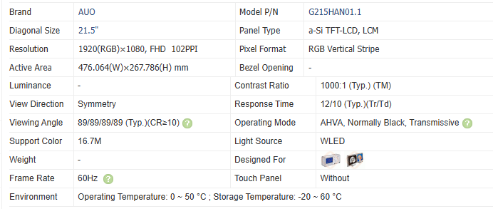 โมดูลจอ LCD อุตสาหกรรม AUO 21.5 นิ้ว ใหม่เอี่ยม ความละเอียด 1920*1080 FHD สำหรับการถ่ายภาพทางการแพทย์ รุ่น G215HAN01.1/ G215HAN01.2/ G215HAN01.201