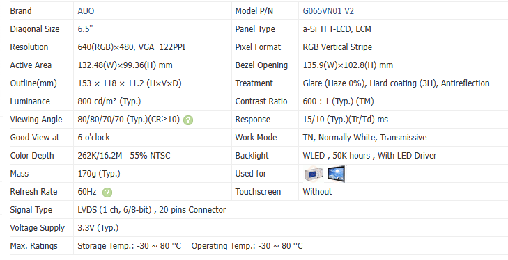 จอ LCD AUO 6.5 นิ้ว รุ่น G065VN01 V221 G065VN01 V2 ความละเอียด 640*480 ความสว่าง 800nits แบบ LVDS 20 พิน ส่งเร็ว