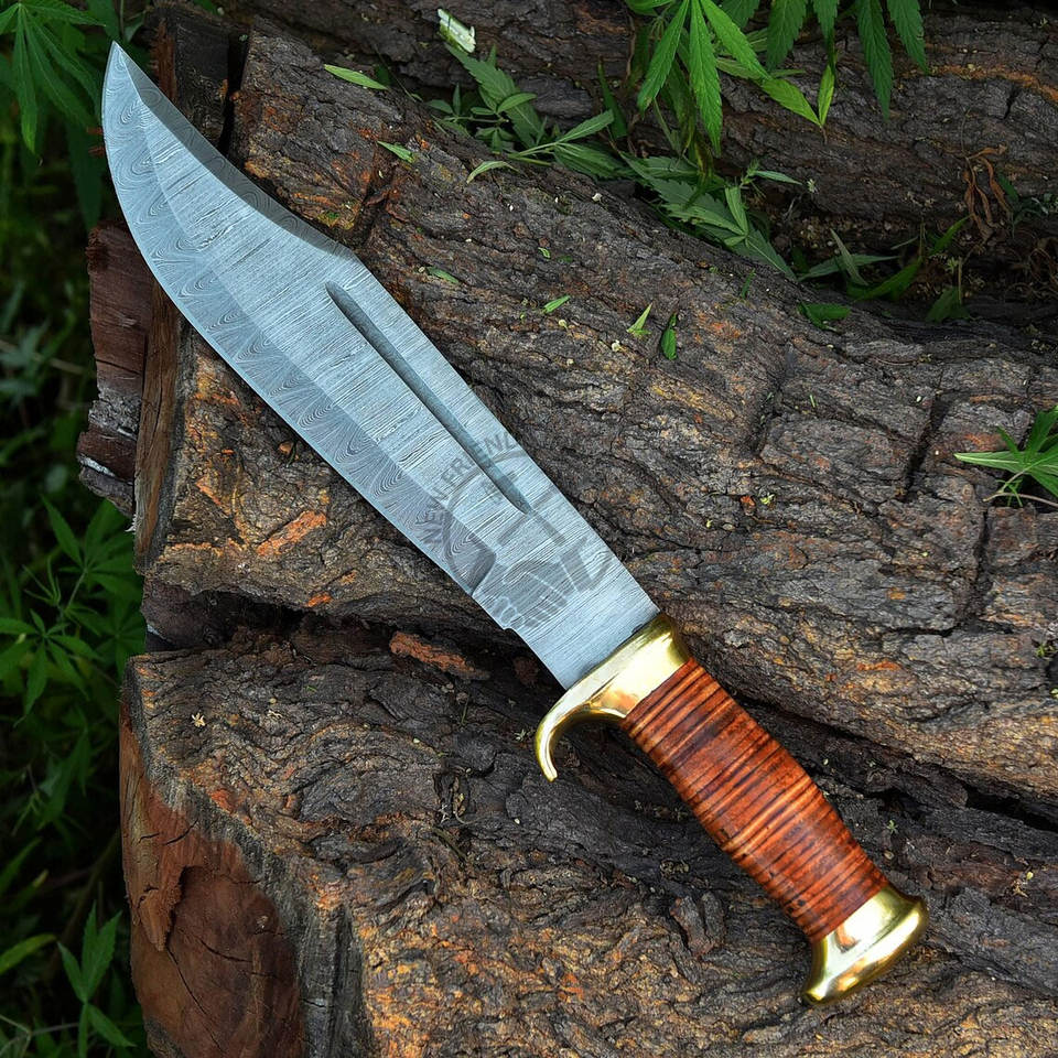 มีดโบวี่เหล็กดามัสกัสทำมือแบบสั่งทำใหม่เอี่ยม มีดล่าสัตว์และเอาตัวรอดสำหรับนักสะสม พร้อมด้ามจับทองเหลืองหุ้มหนัง ใบมีดขนาด 10.5 นิ้ว