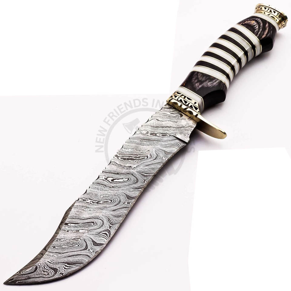 มีดโบวี่เหล็กดามัสกัสทำมือใหม่เอี่ยม คมกริบ ใบมีดคงที่ สำหรับล่าสัตว์และตั้งแคมป์ ด้ามจับทำจากไม้และกระดูก
