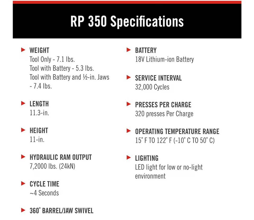 ชุดเครื่องมืออัดไฮดรอลิก ProPress รุ่น 67053RP350 ของแท้ใหม่เอี่ยม 8 ชิ้น พร้อมที่ชาร์จแบตเตอรี่ 18 โวลต์ หัวอัด 4 แบบ ขนาด 1/2 นิ้ว ถึง 2 นิ้ว และกล่องเก็บ