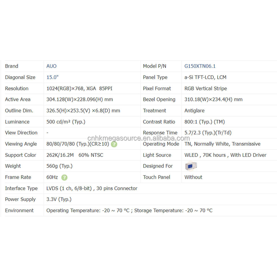 จอแอลซีดีของแท้ใหม่เอี่ยม G150XTN06.1 AUO โมดูลจอแอลซีดี 15 นิ้ว ความละเอียด 1024*768 แบบ LVDS