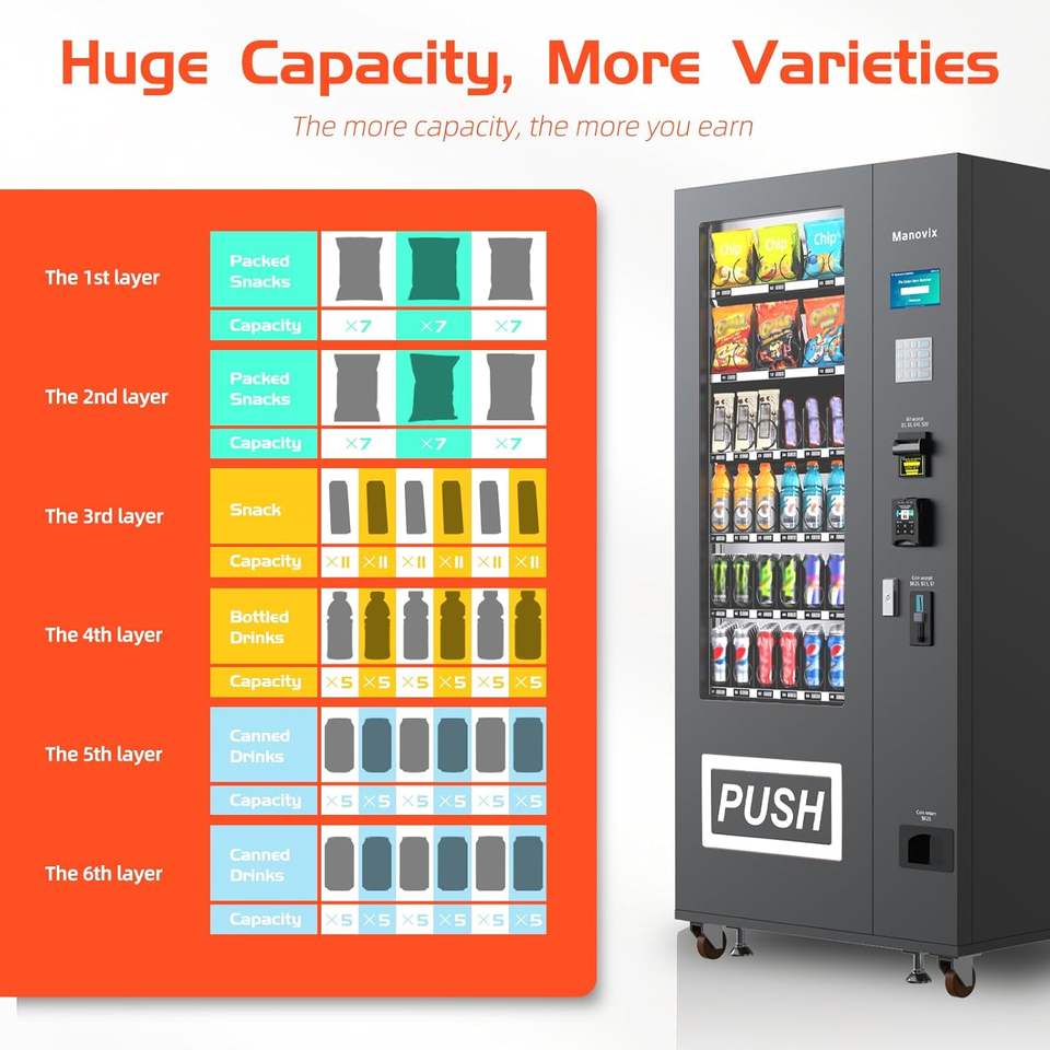 ตู้จำหน่ายขนมและเครื่องดื่มแบบคอมโบพร้อมบัตรจ่ายบิลและเหรียญ