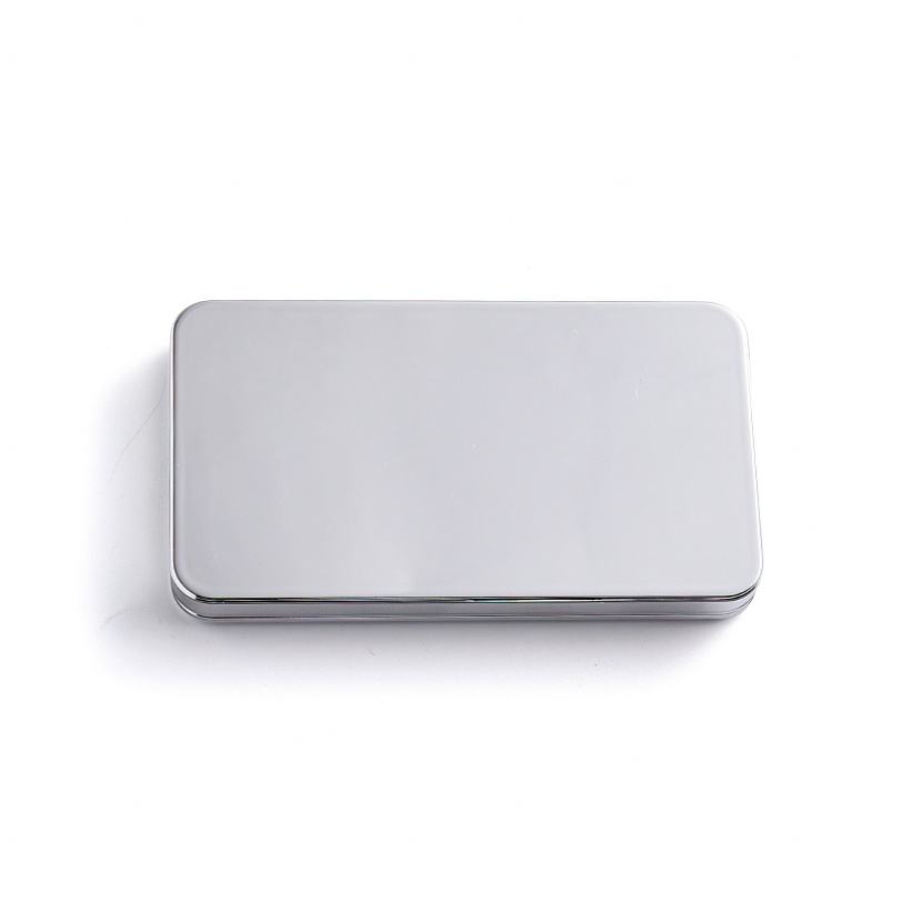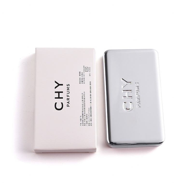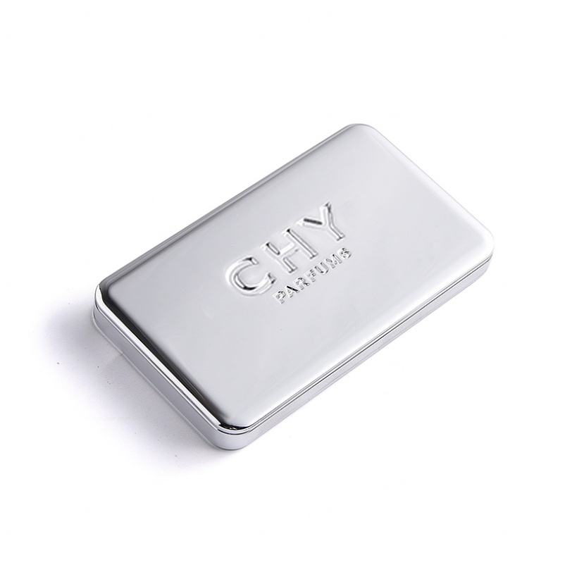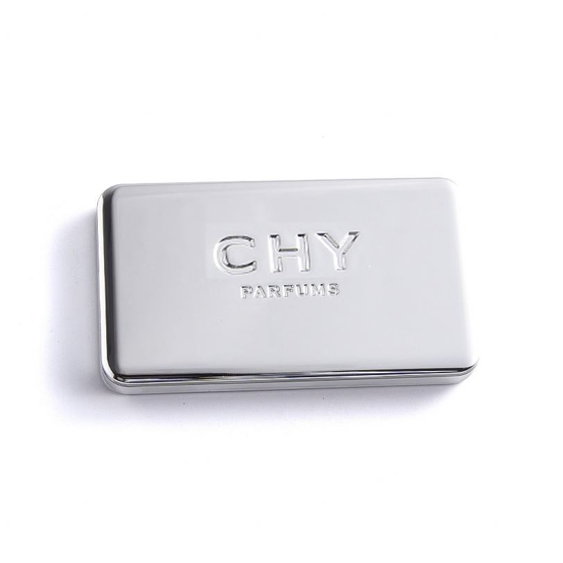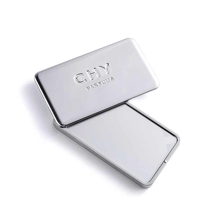 กระจกแต่งหน้าพกพาแบบหมุนได้ ทรงสี่เหลี่ยมเล็ก สีเงิน โลหะ ปั๊มนูน พร้อมโลโก้