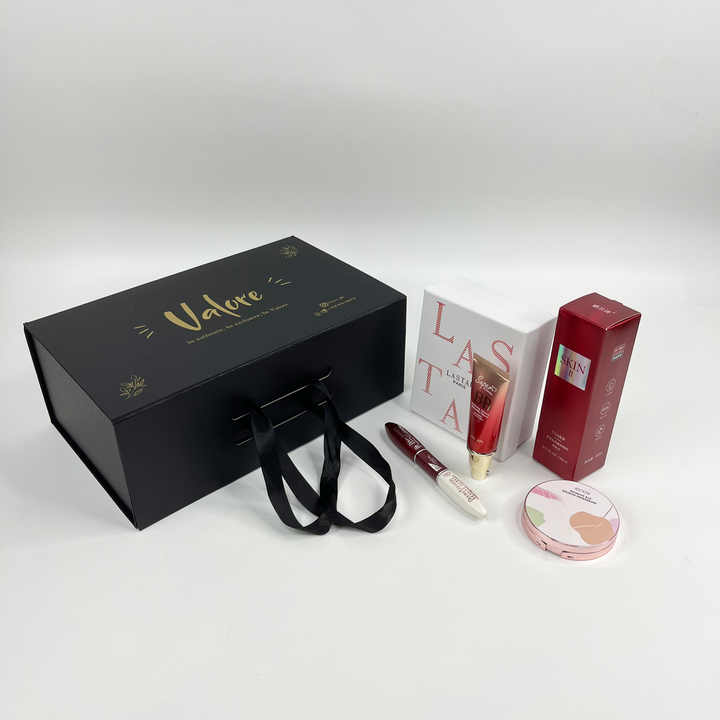 กล่องของขวัญเครื่องสำอางแบรนด์ดัง - กล่องแม่เหล็กสีดำแบบพับได้ พร้อมปั๊มฟอยล์ทอง สำหรับผลิตภัณฑ์ดูแลผิวและเครื่องสำอาง
