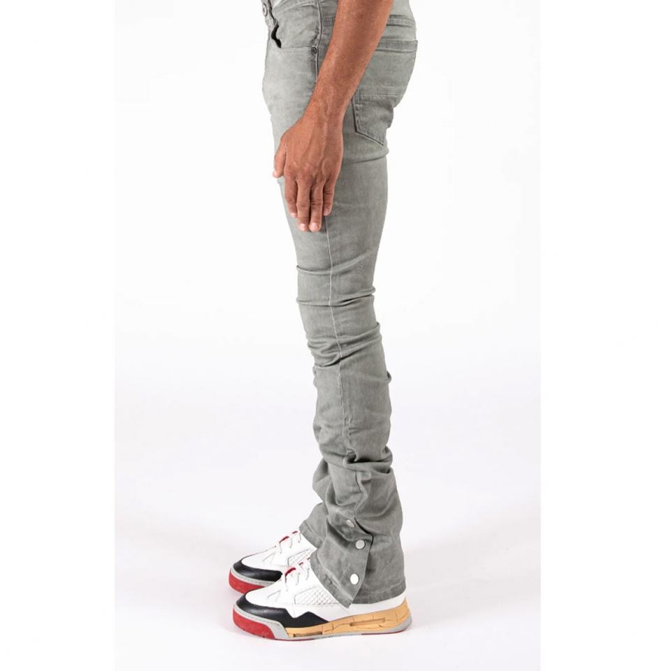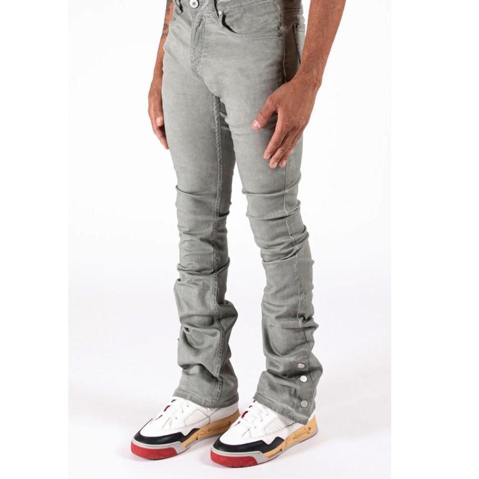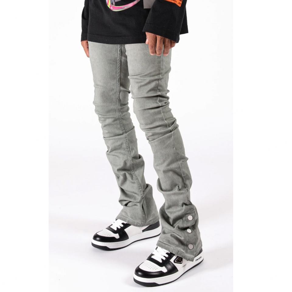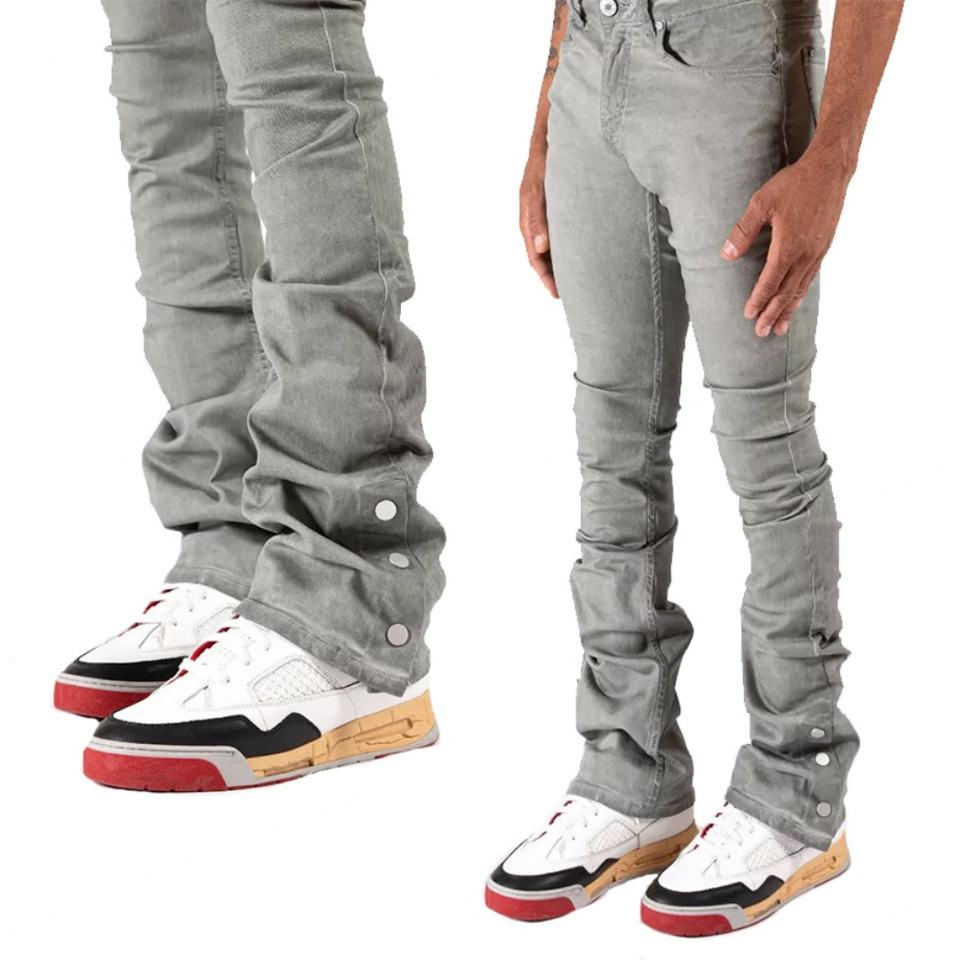 กางเกงยีนส์เดนิมทรงแฟลร์ติดกระดุมแบบสั่งทำพิเศษสำหรับผู้ชาย สไตล์หรูหรา สีเทา กางเกงยีนส์เดนิมผู้ชายทรงสแตกด์แบบซ้อนทับ