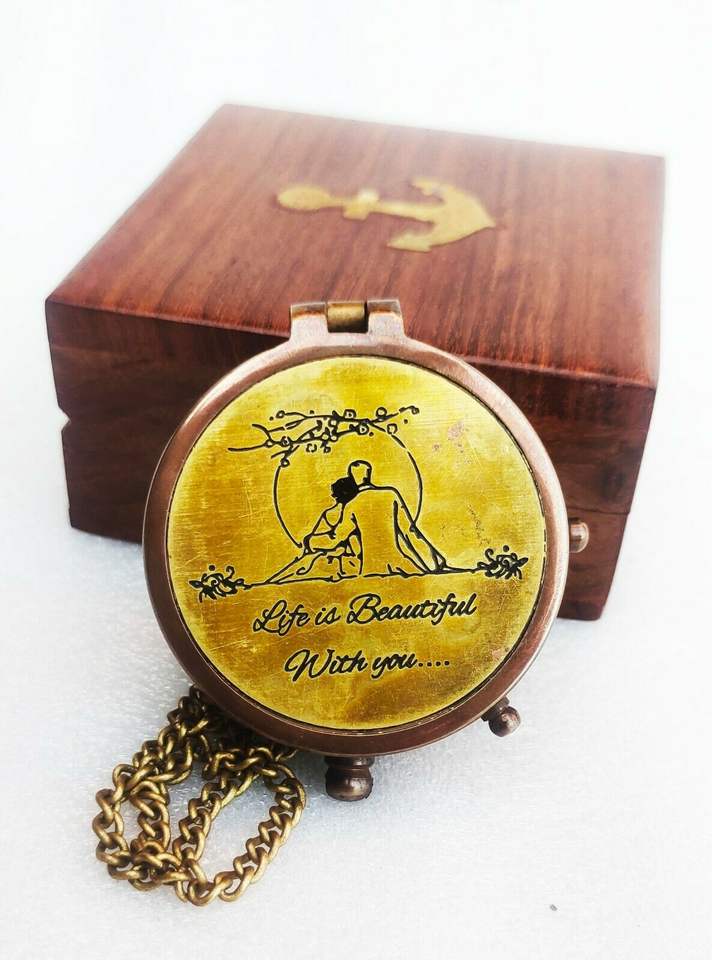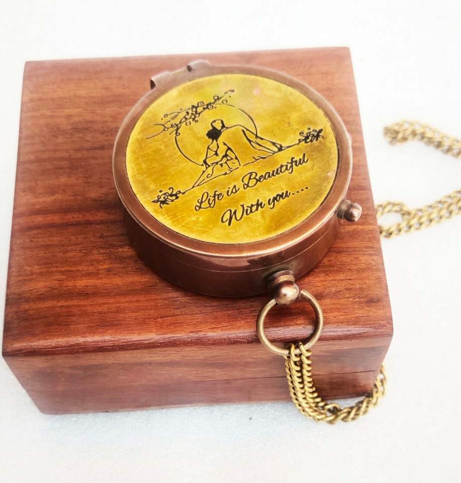 เข็มทิศทองเหลืองโบราณหน้าปัดแกะสลักขนาด2นิ้วมีฝาปิดเข็มทิศเรือทะเลพร้อมกล่องไม้สำหรับตั้งแคมป์เดินป่า