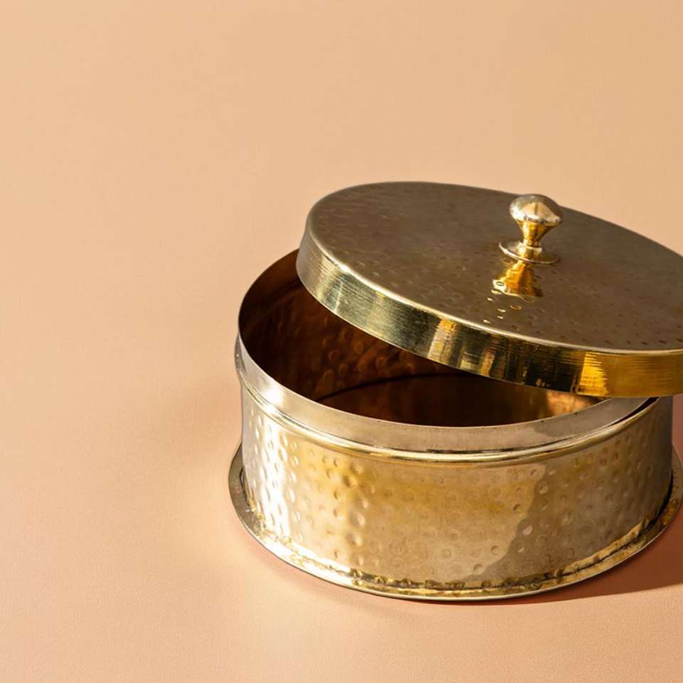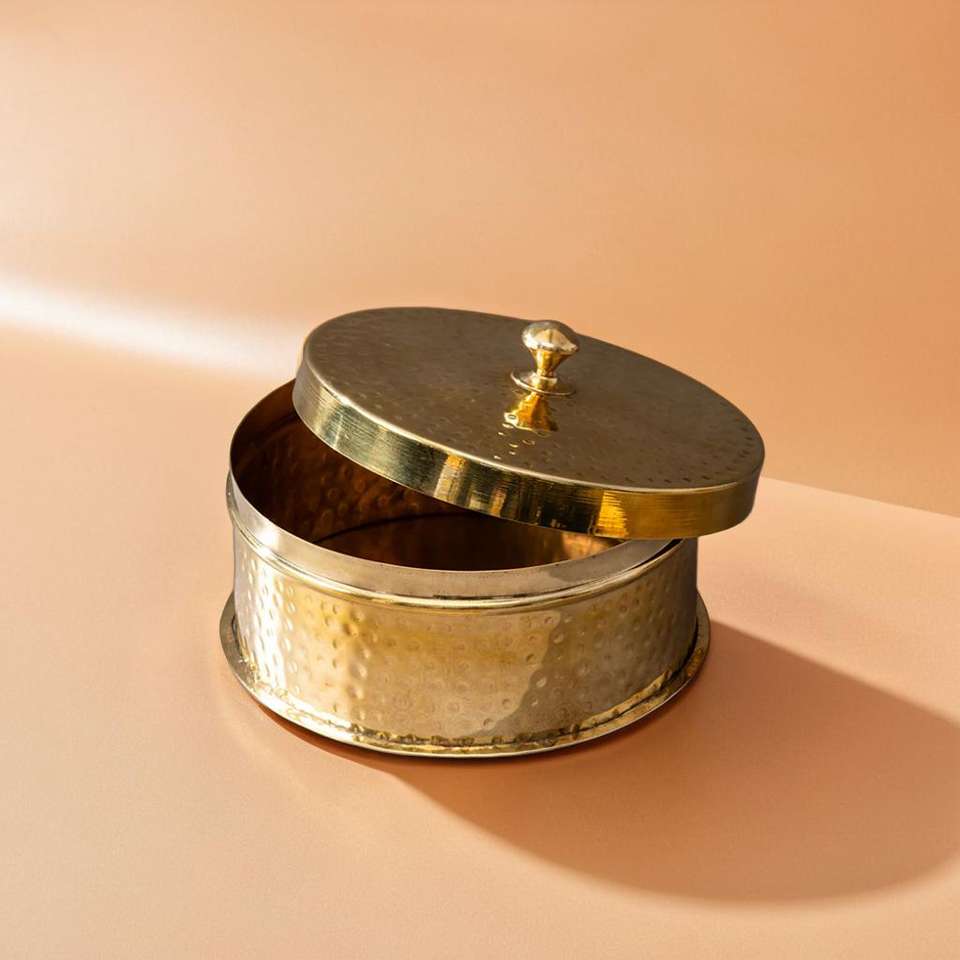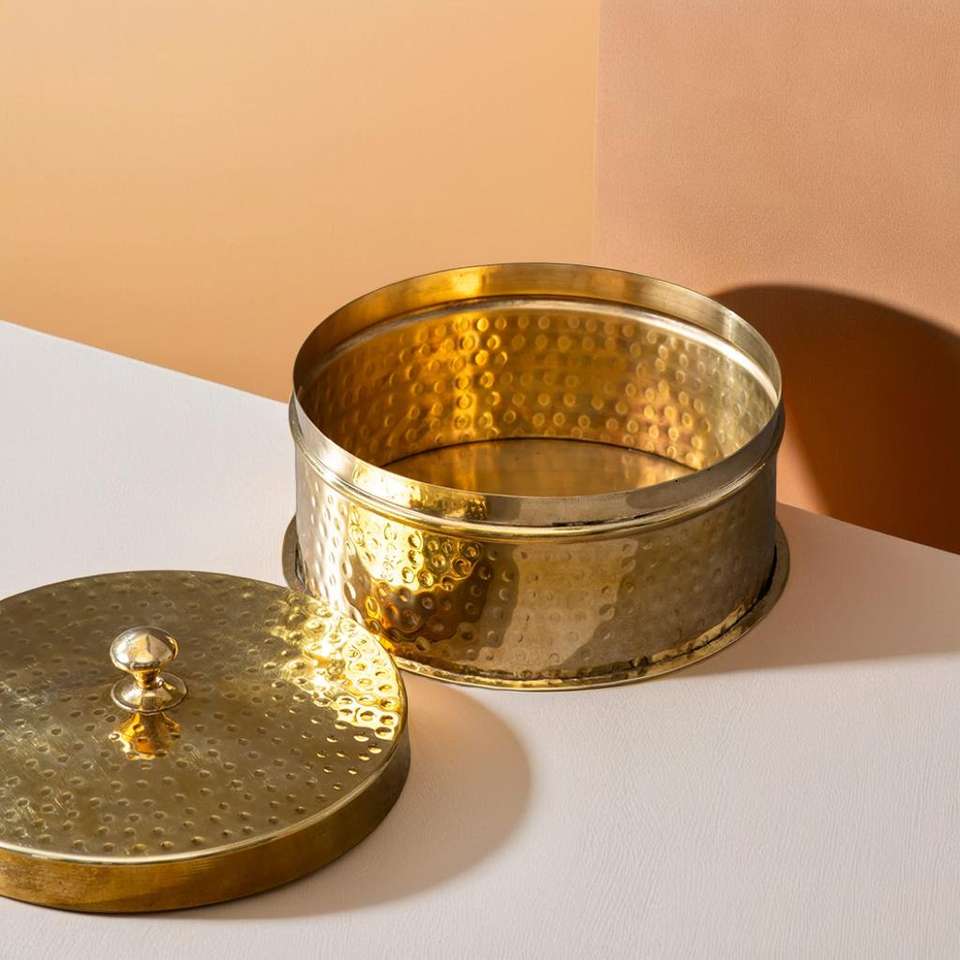 กล่องชาปาติทองเหลืองหรือโรตี้แดบบ้าที่เก็บของด้วยมือสำหรับขนมปังแบนอินเดียและใช้ในชีวิตประจำวัน