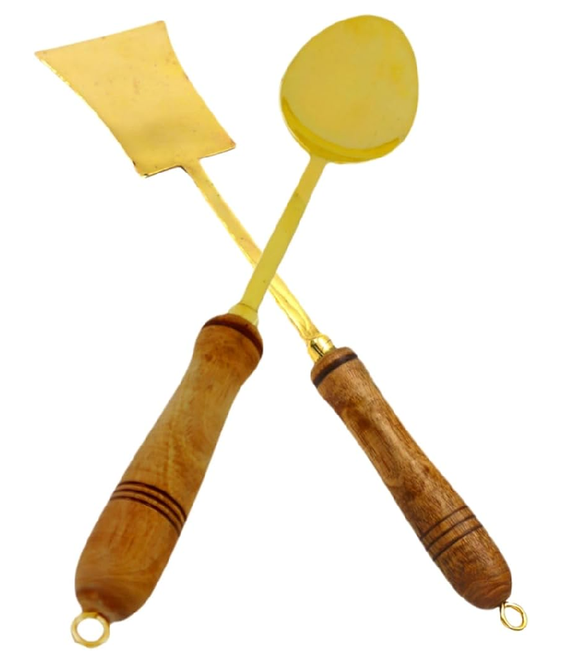 ช้อนทองเหลืองสำหรับทำอาหารช้อนไม้พายและช้อนเสิร์ฟ2ชิ้นด้ามไม้ขัดเงาสีทองราคาไม่แพง
