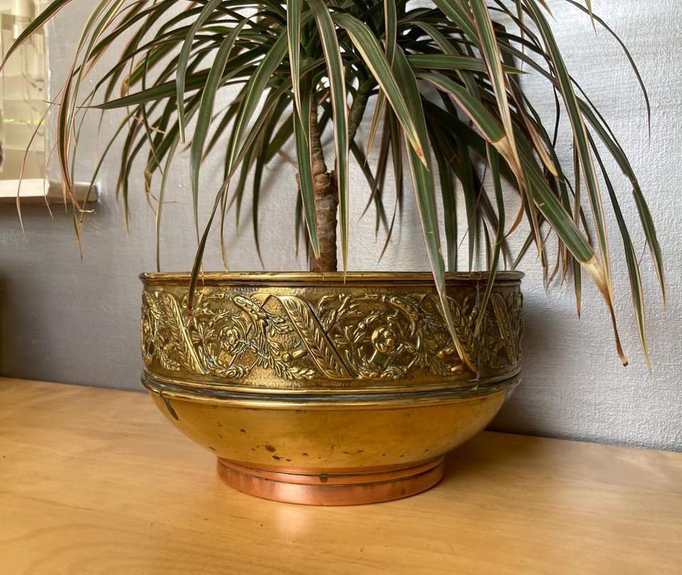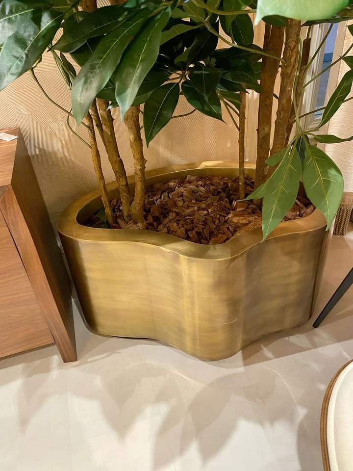 กระถางปลูกต้นไม้ทองเหลืองเคลือบผิวพร้อมโต๊ะทองเหลือง กระถางปลูกต้นไม้ดีไซน์สวยงามสำหรับระเบียง ภาชนะปลูกต้นไม้ที่ให้ความรู้สึกหรูหรา