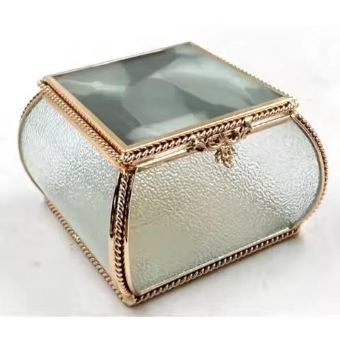 กล่องเครื่องประดับจิวเวลรี่ทองเหลืองและแก้วพร้อมฝาปิดลายดอกไม้และนกแกะสลัก
