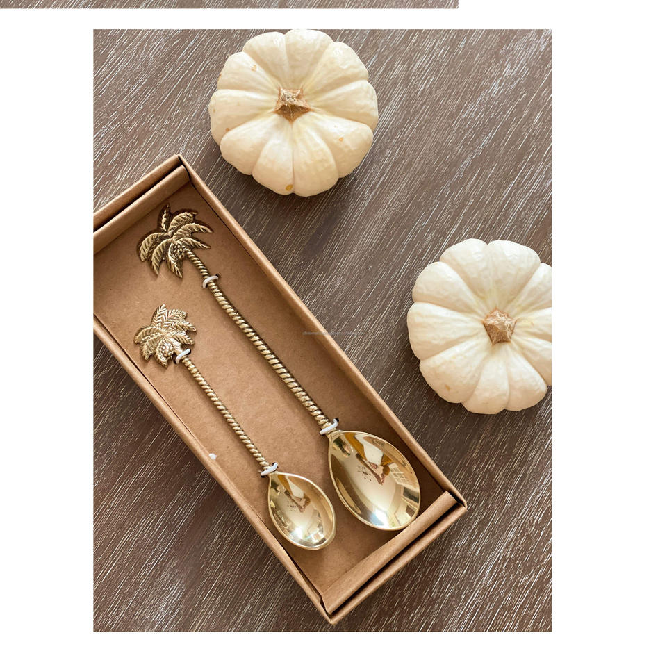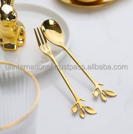 เครื่องใช้บนโต๊ะอาหารสีทองทองเหลืองพร้อมด้ามจับดีไซน์ต้นปาล์มช้อนส้อมมีดทองเหลืองใช้ในบ้านช้อนทองเหลืองทำจากกระจก