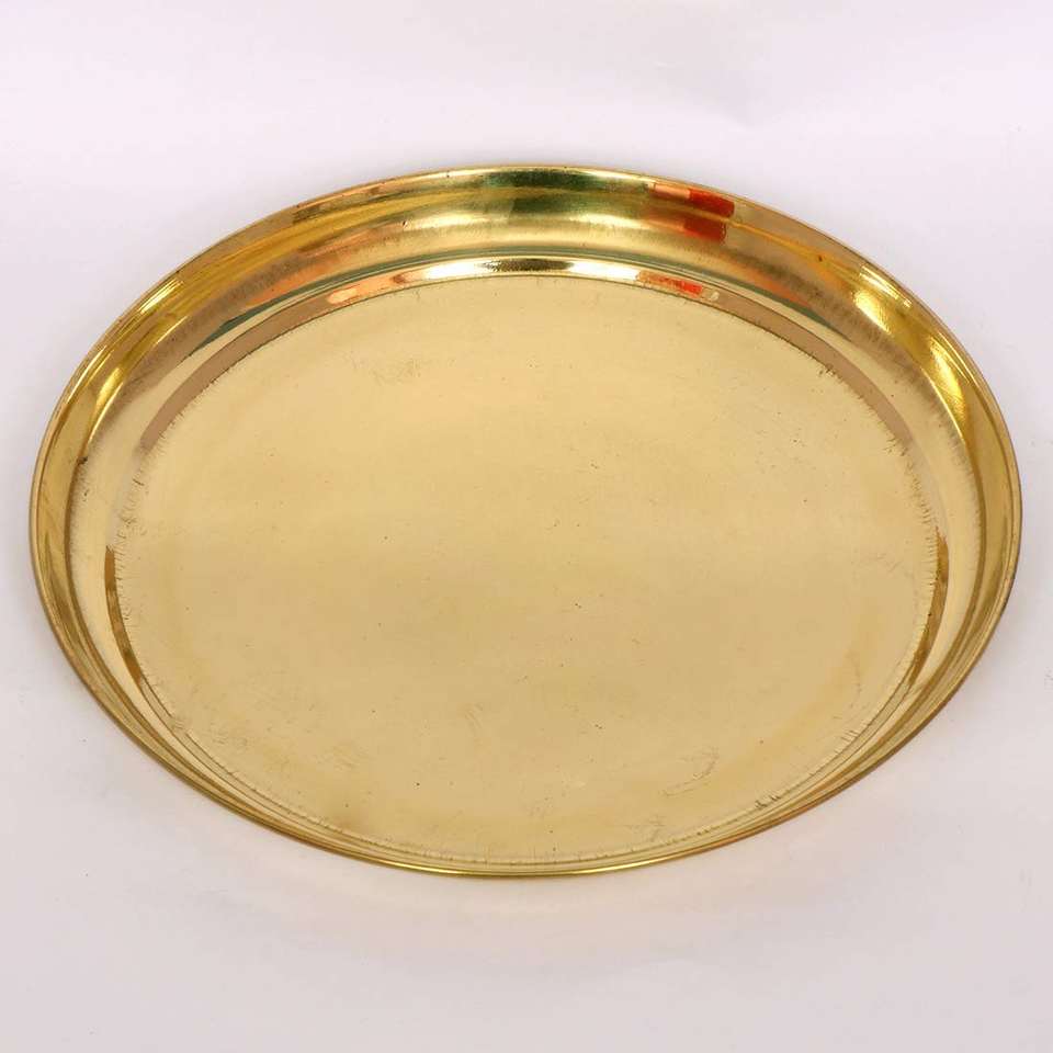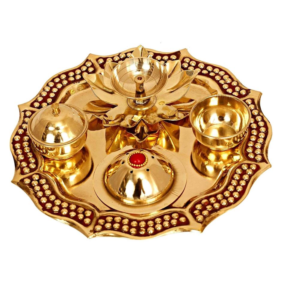 แผ่นทองเหลืองสีทอง pooja thali แผ่นทองเหลืองที่ใช้ในบ้านวัดจิตวิญญาณมีการแกะสลักดีไซน์สำหรับงานปาร์ตี้