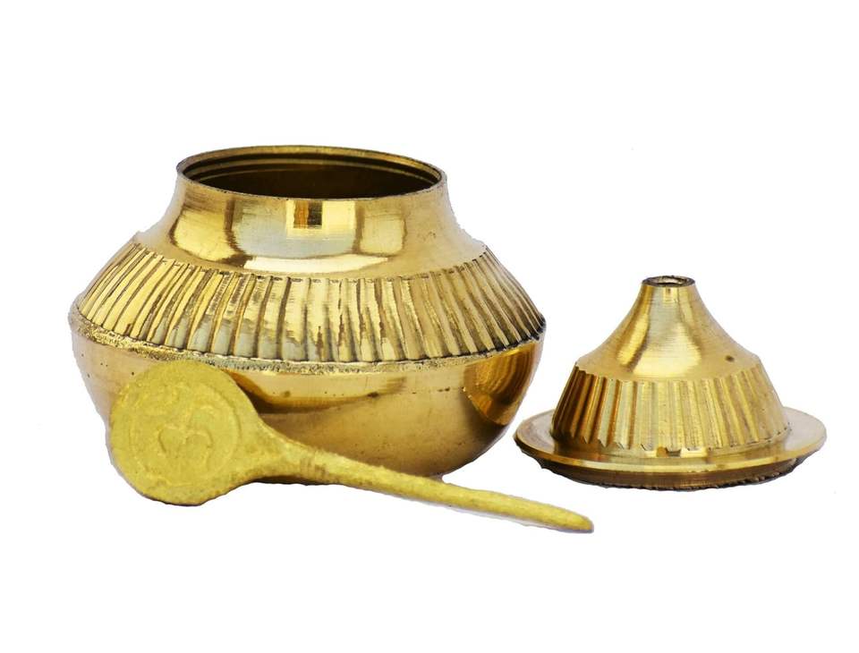 กล่องทองเหลืองสมัยใหม่สำหรับพิธีบูชา พร้อมที่เก็บรักษาอุปกรณ์ครบครัน เช่น โรล ชาวลา ชันดัน ฮัลดี คุมคุม ซินดูร์ ขมิ้น ดับบี แกะสลักอย่างประณีต วางบนโต๊ะได้ คุณภาพสูง