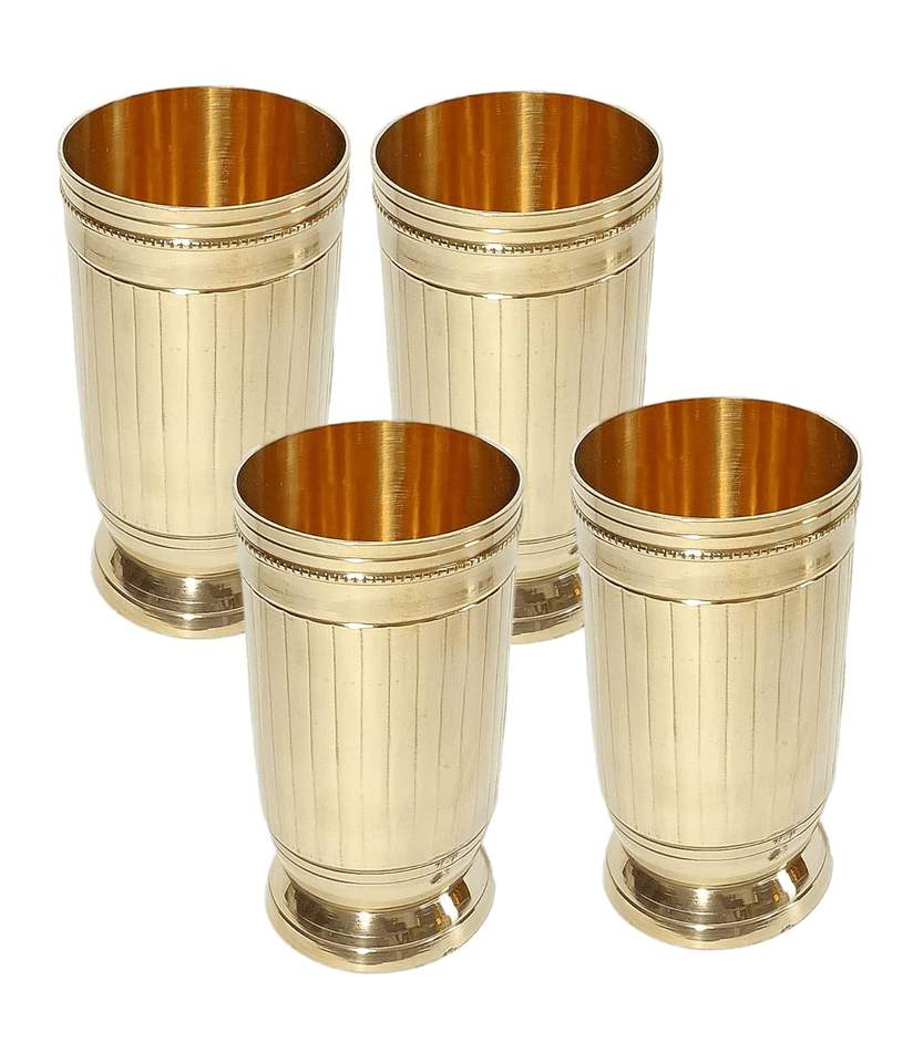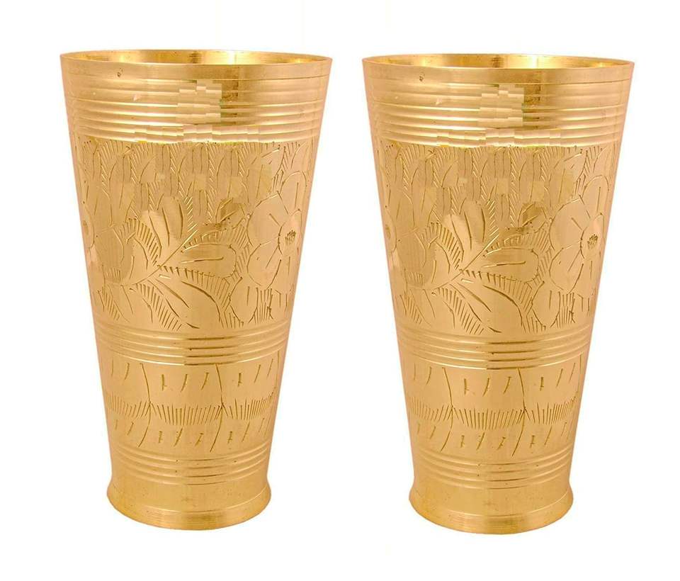 ชุดแก้ว Lassi ทองเหลืองขนาดใหญ่2แก้ว, (1 LTR) ทองเหลืองบริสุทธิ์, น้ำหนักหนักและกระจกที่ดูดี