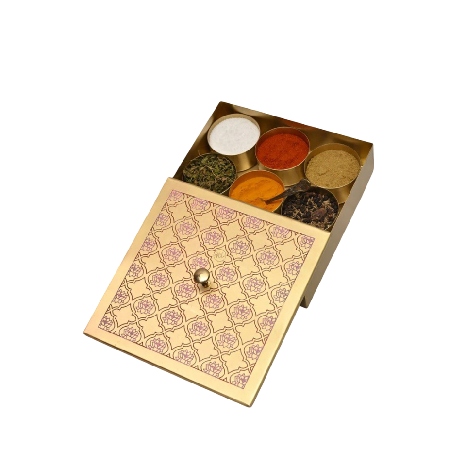 กล่องเครื่องเทศมาซาลาด้าบาบา ทำจากทองเหลือง ฝาปิดสลักลายดอกไม้ งานแฮนด์เมด ภาชนะเก็บของในครัว รูปทรงสี่เหลี่ยมพร้อมลวดลาย