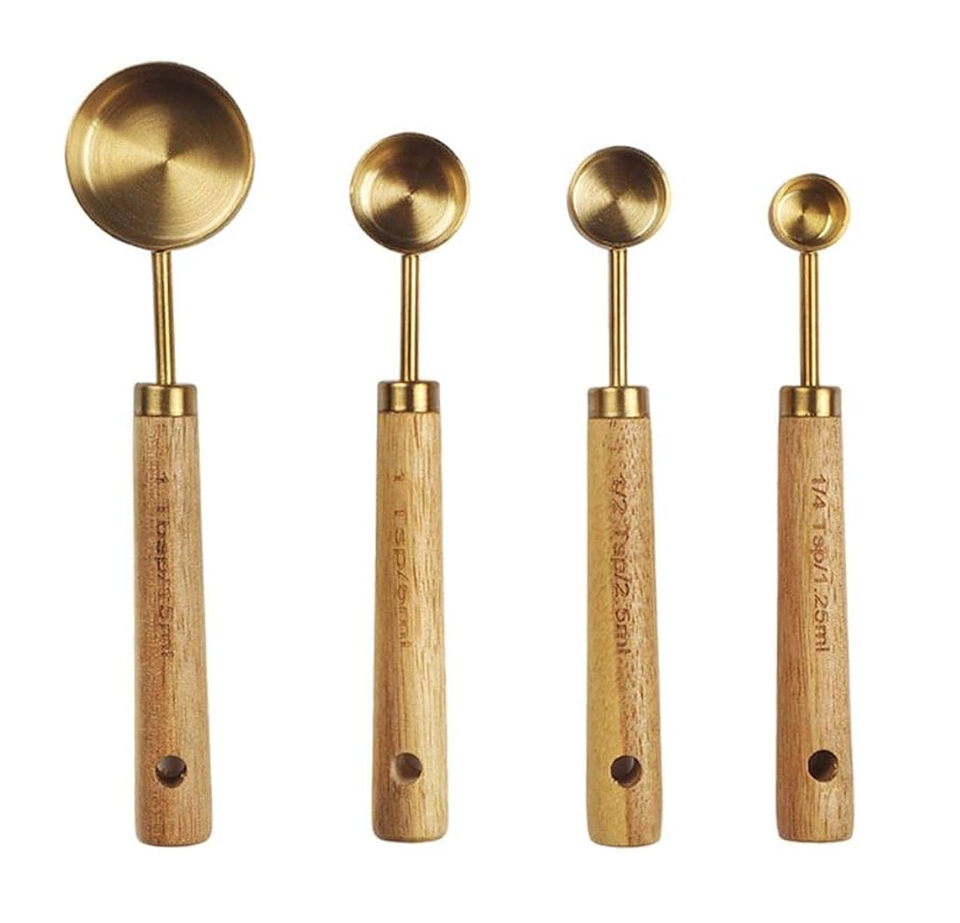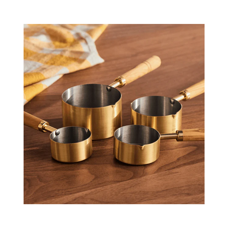 ถ้วยตวงและช้อนตวงทองเหลืองช้อนออกแบบให้มีด้ามวัดทำจากไม้